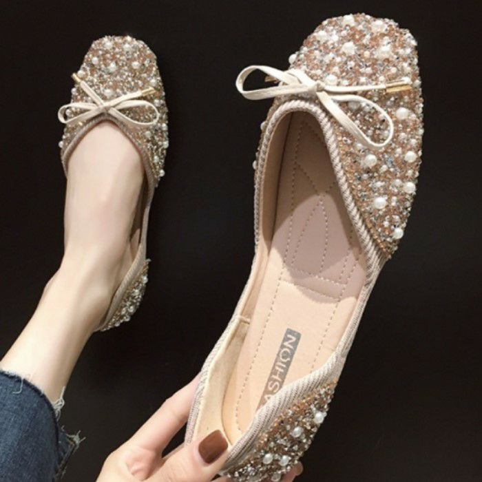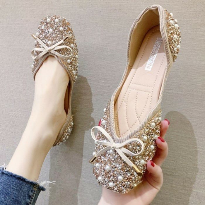 パール+ビジュー+リボンの華やかなフラットシューズ。