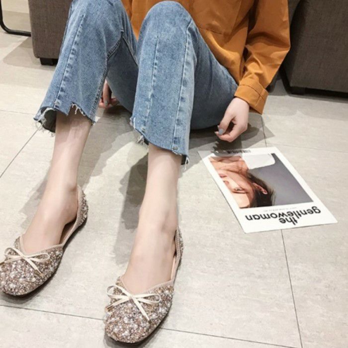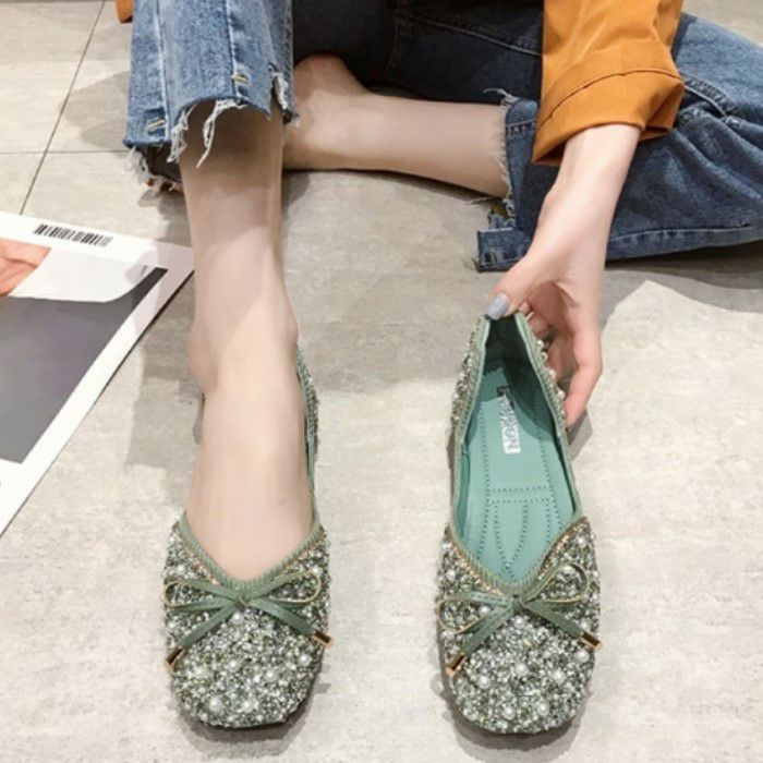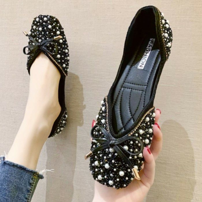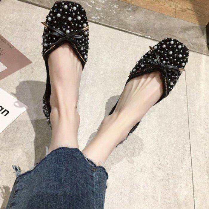 即納* 3color ラウンドトゥ リボン ビジュー パール vカット ペタンコ フラット シューズ