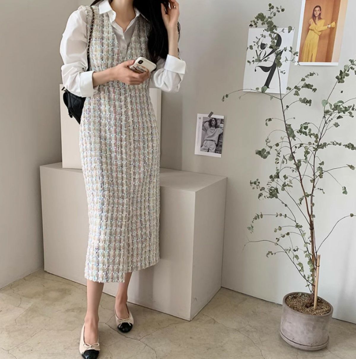 予約 2color ツイード ミモレ丈 Vネック ワンピース