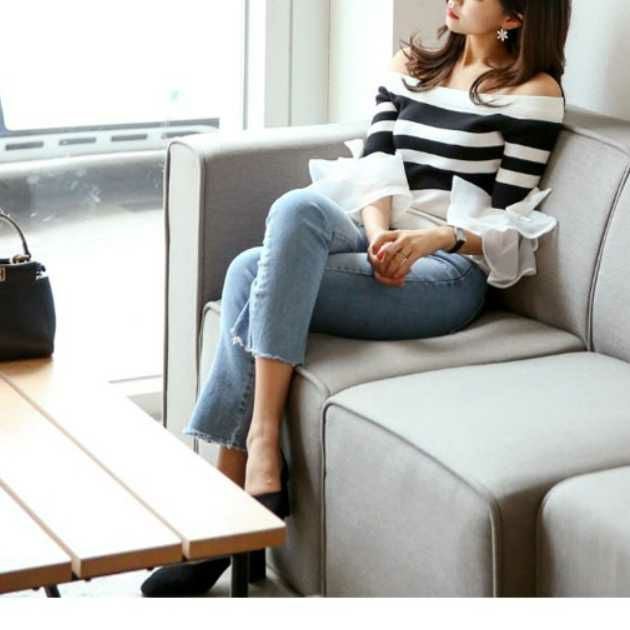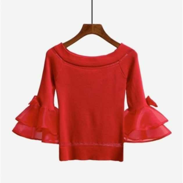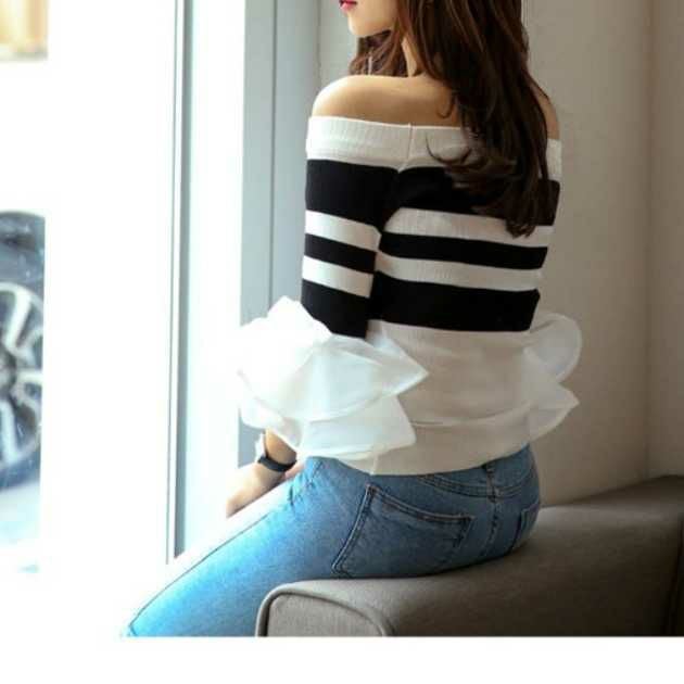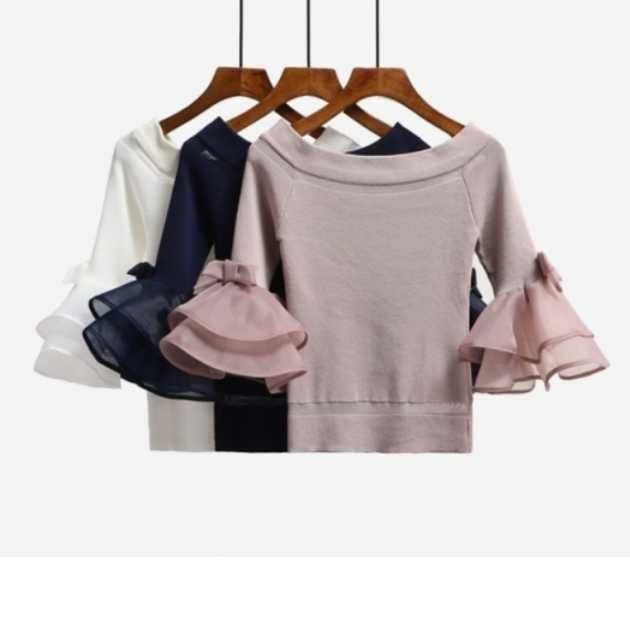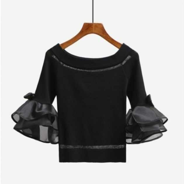 予約 9color オーガンジー フリル 袖 オフショルダー ニット