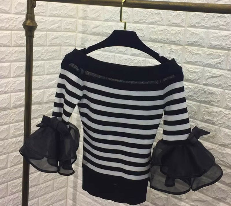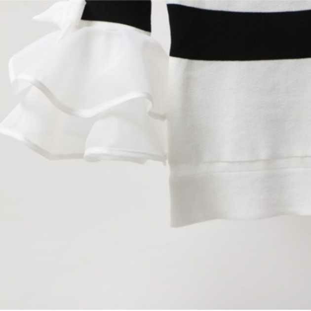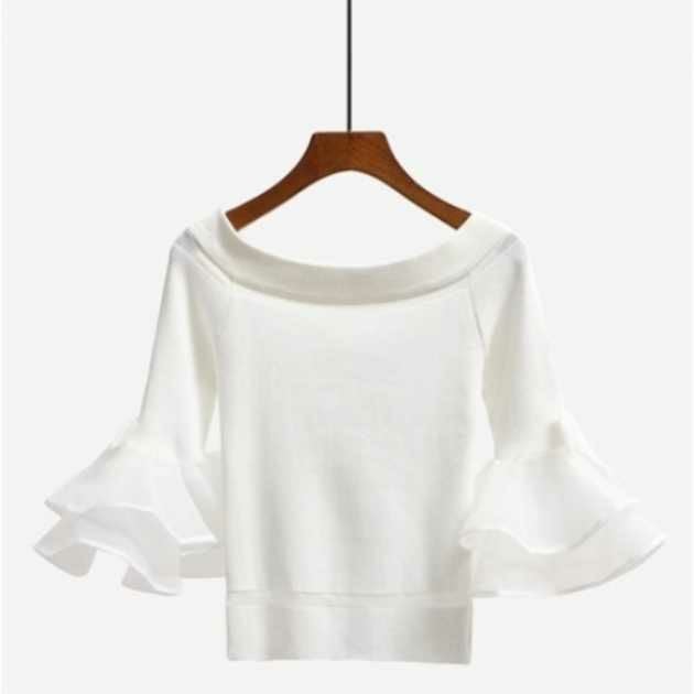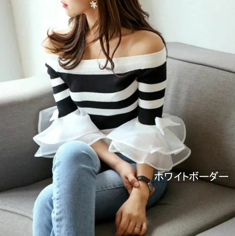 ハリのあるフリルの袖が可愛い オフショルダー ニット