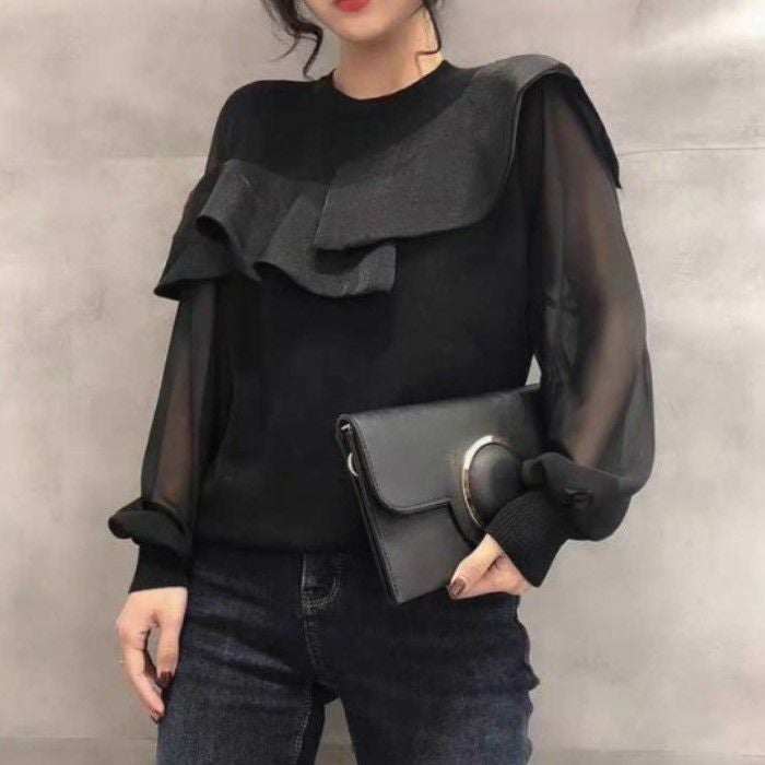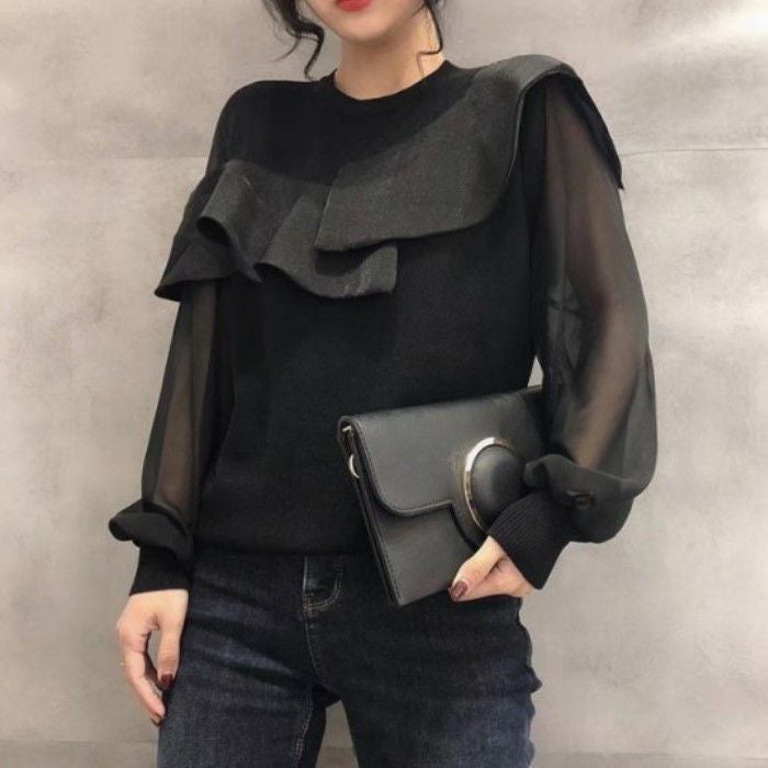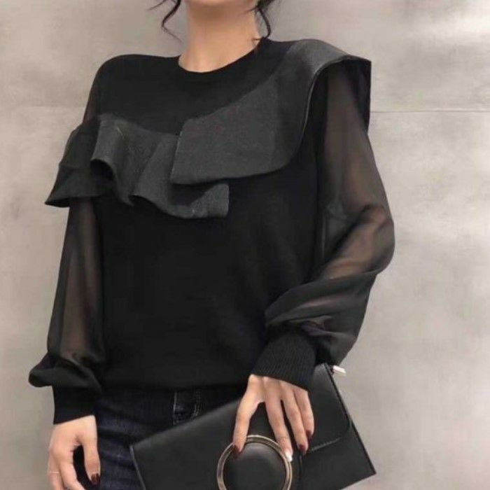 シアー素材がドッキングしたプルオーバートップス