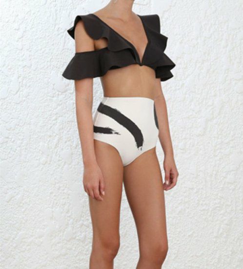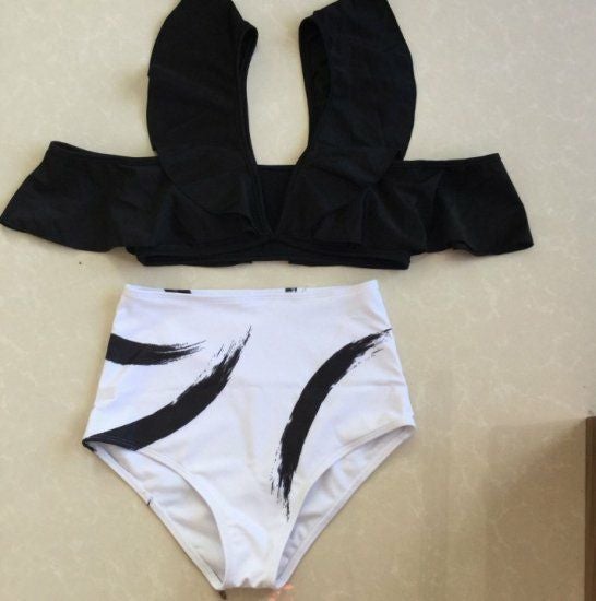 即納*バイカラー フリルヘム オフショルダー ハイウエストビキニ