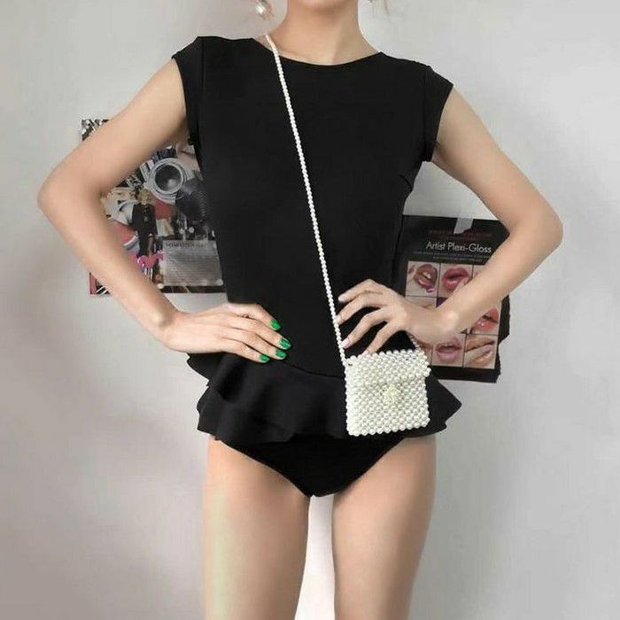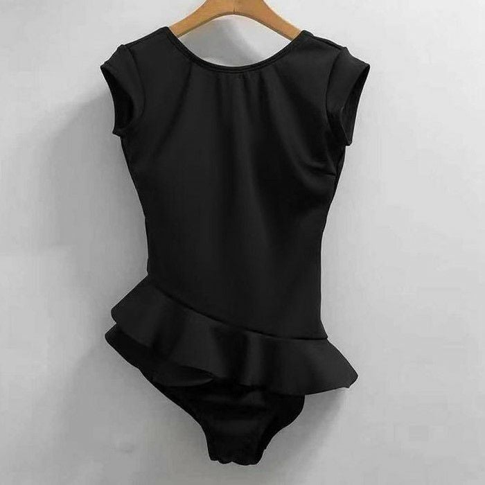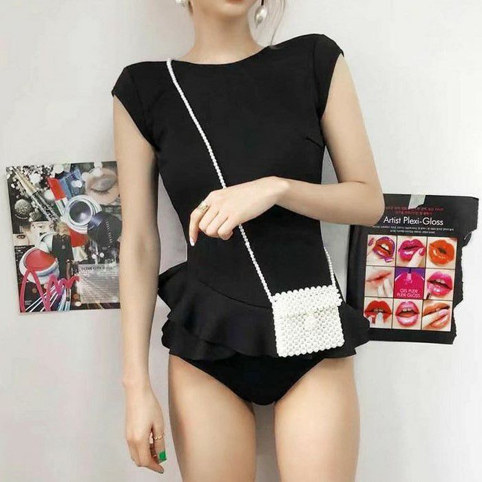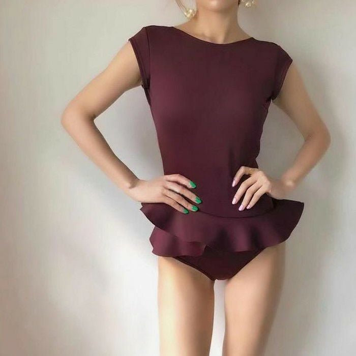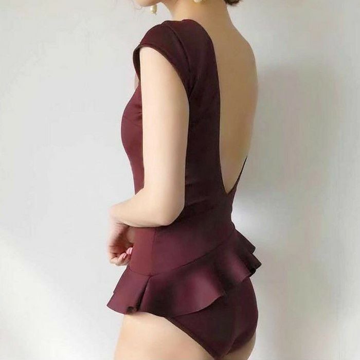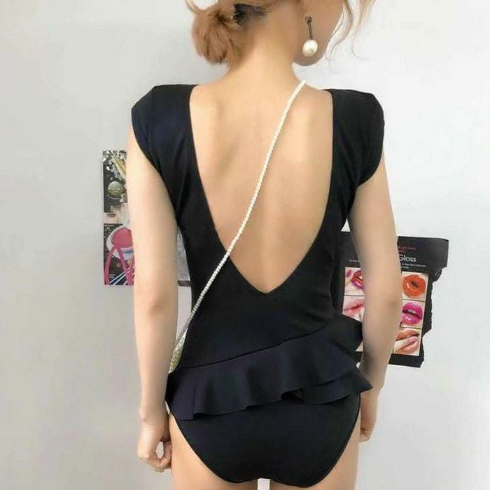 腰回りのフリルと広めに開いたバックシャンな大人可愛いスイムウェア