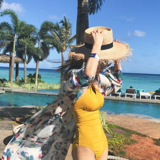 胸元でクロスになった、ひとくせあるワンピース水着。