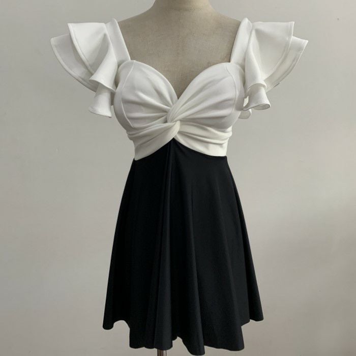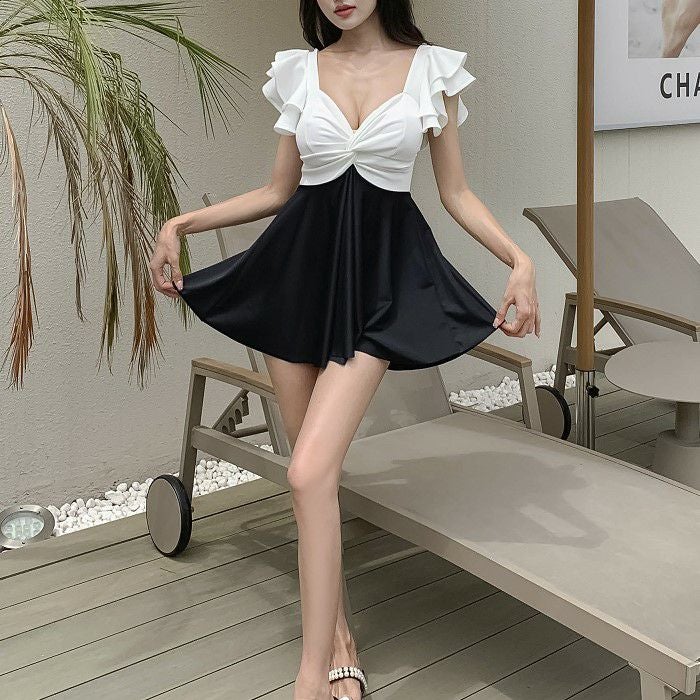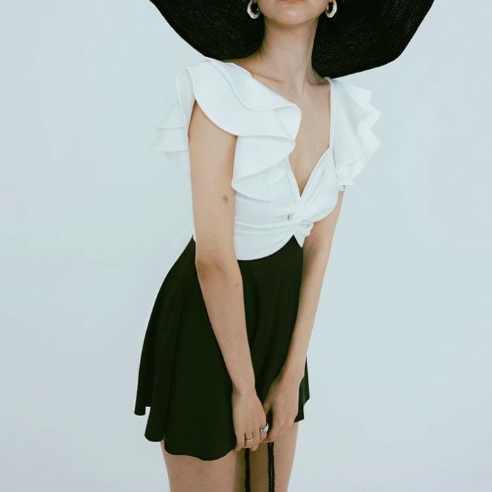重なりあうティアード袖とバイカラーがスタイルアップするスイムウェア