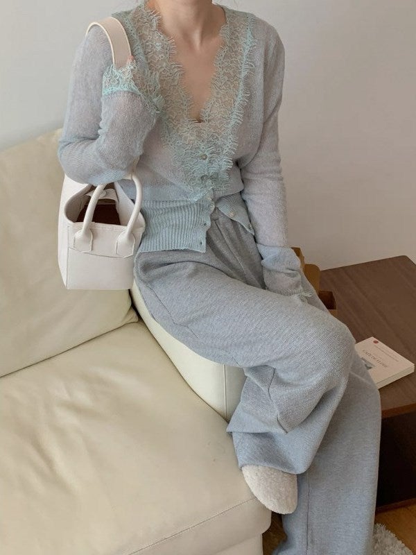 予約 3set ニットセットアップ ペプラム ニット カーディガン ワイドパンツ