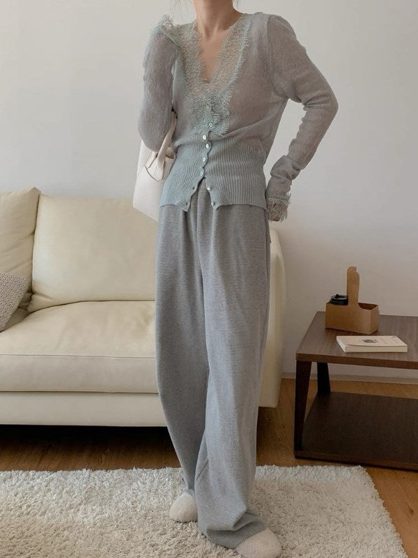 予約 3color ペプラム ニットセットアップ ワイドパンツ + ニットカーディガン