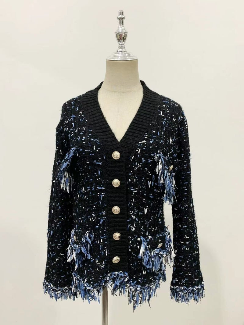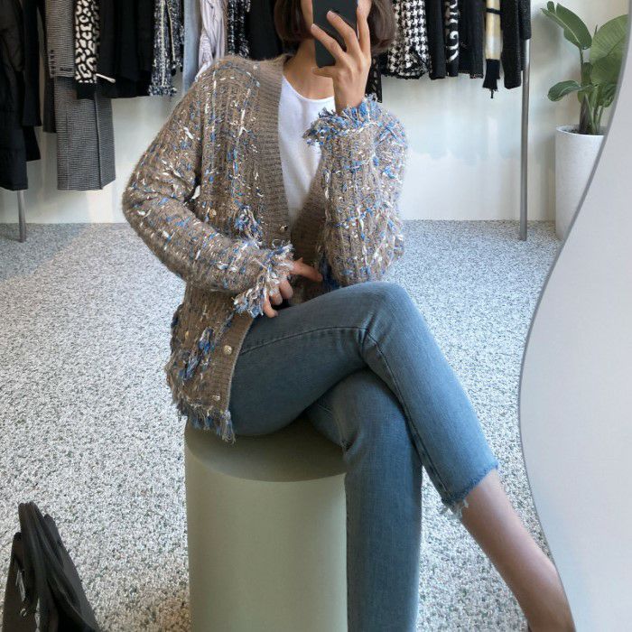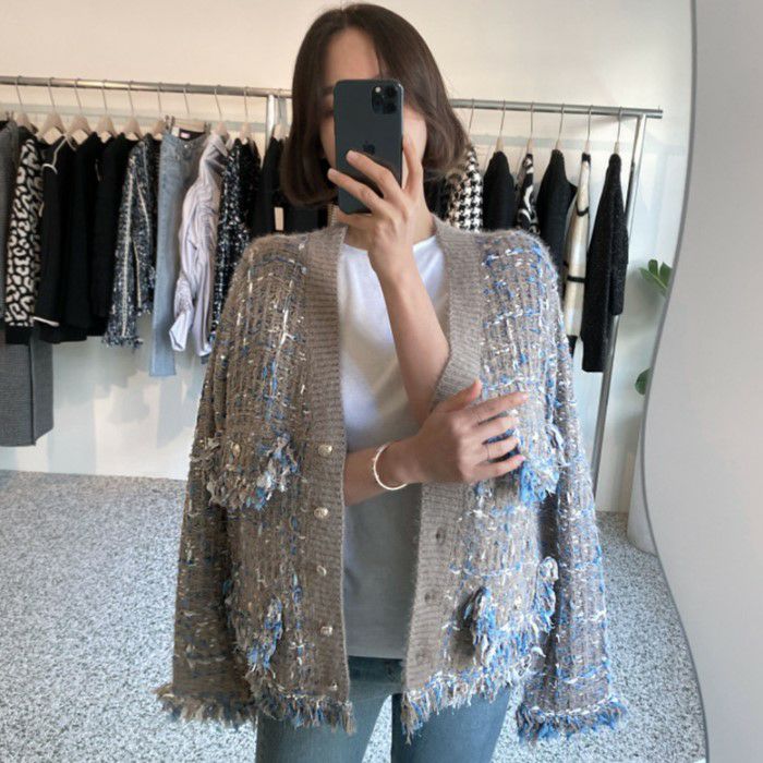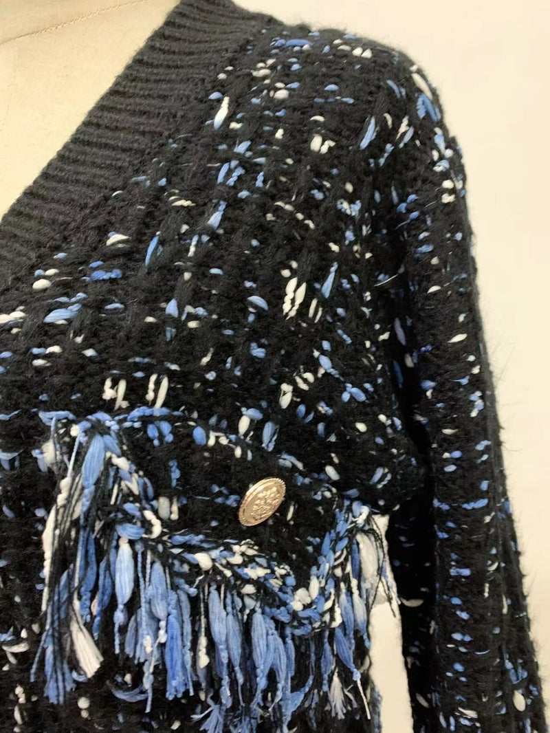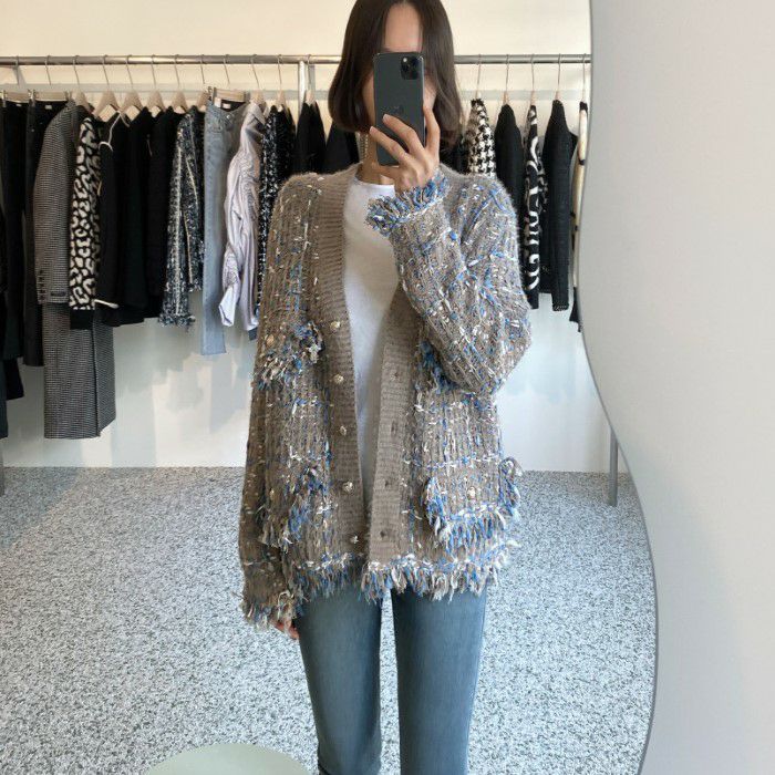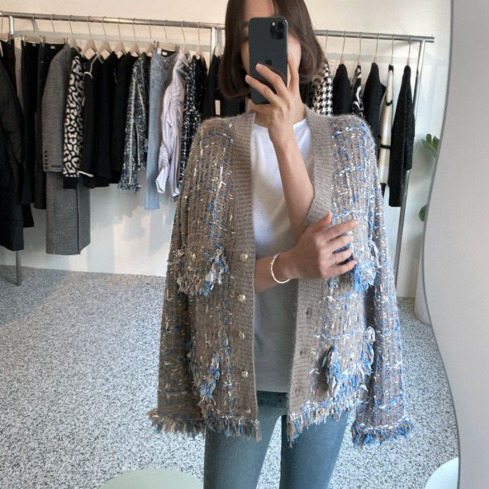 一部即納 2color ニット ツイード風 フリンジ カーディガン
