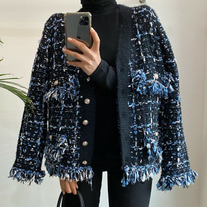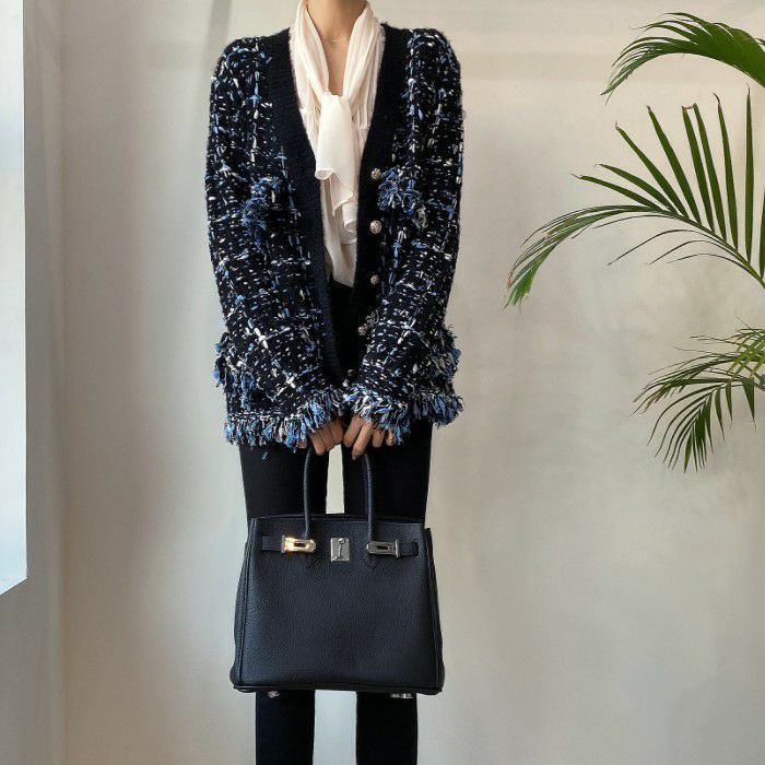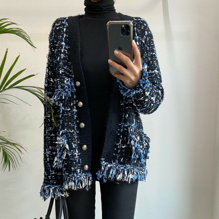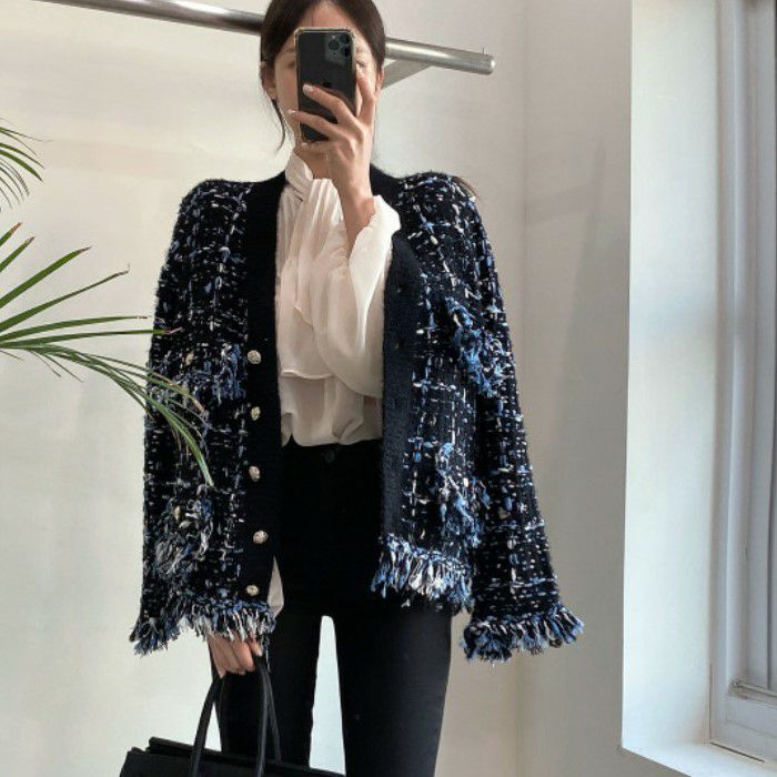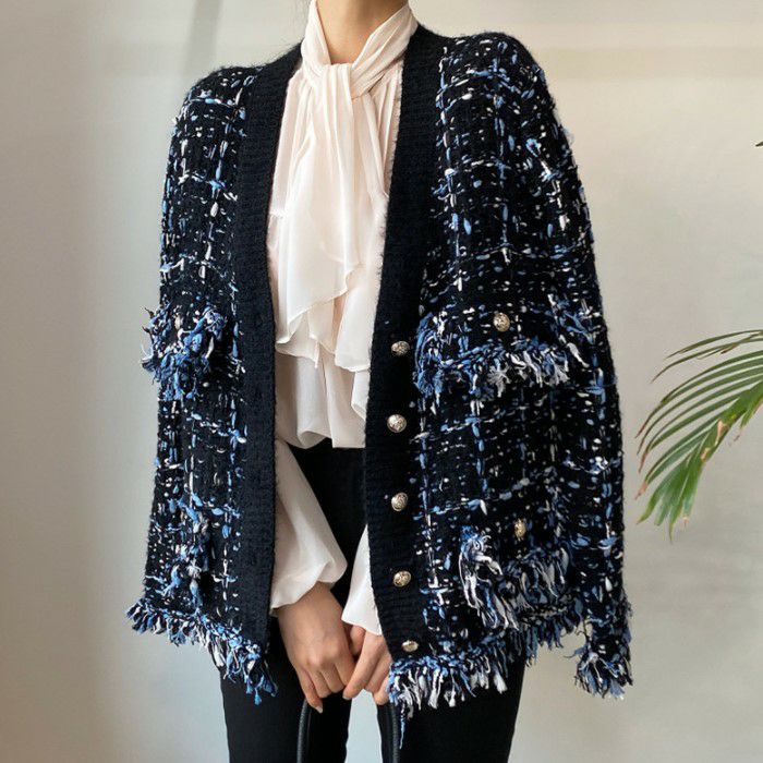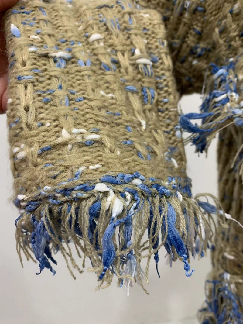 一部即納 2color ニット ツイード風 フリンジ カーディガン