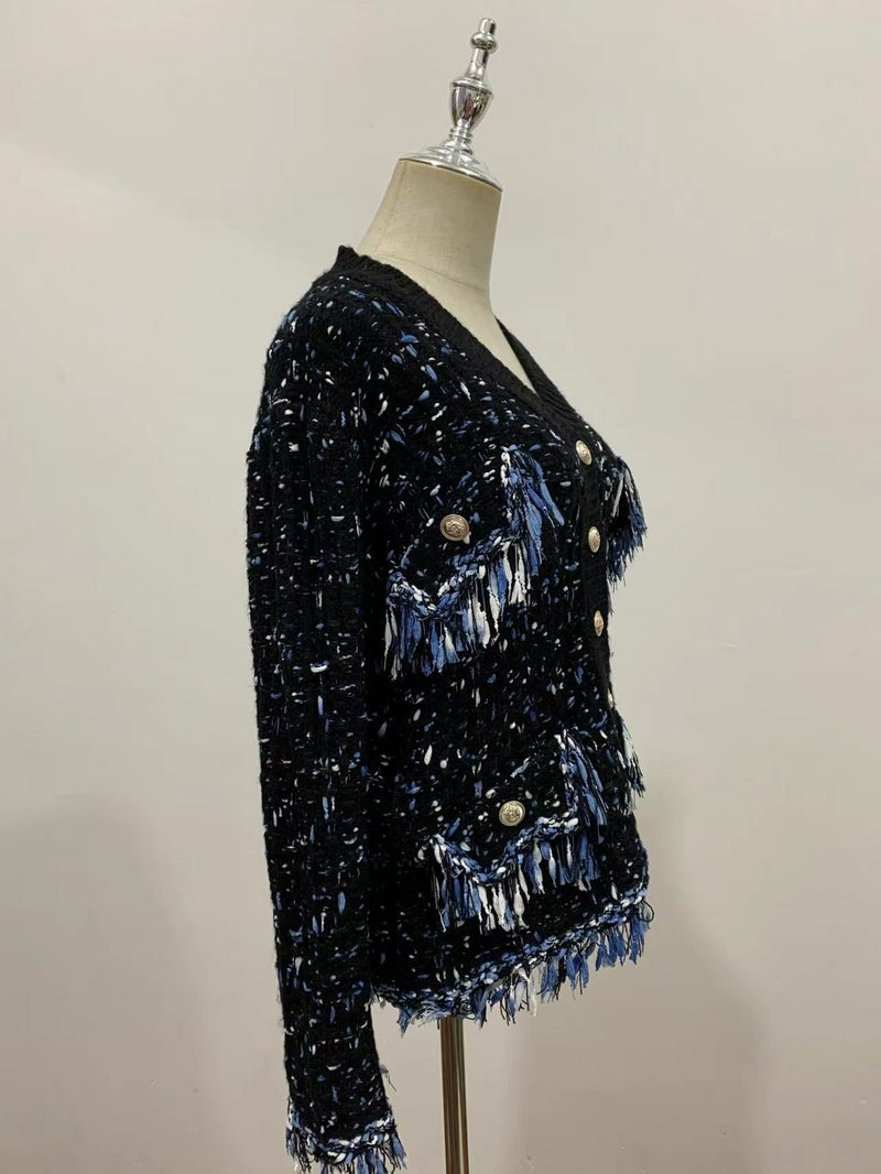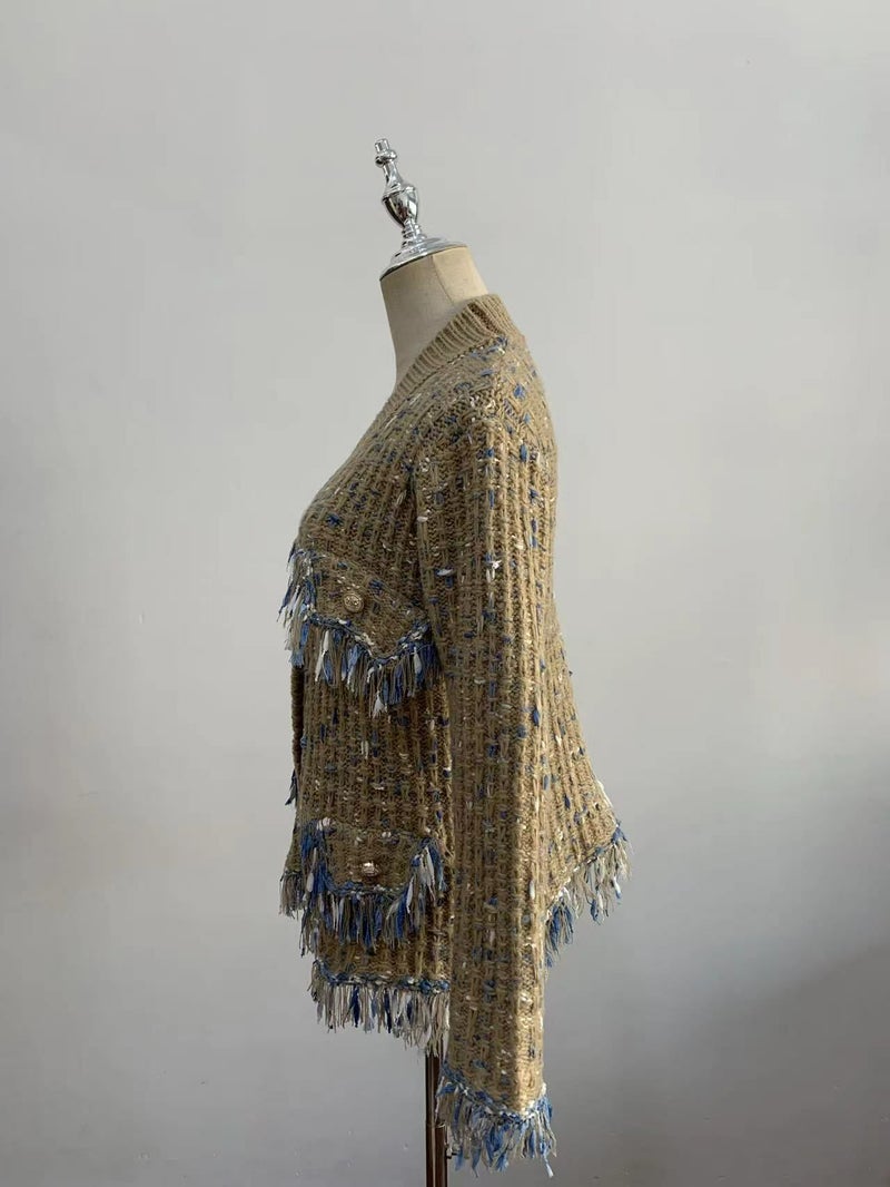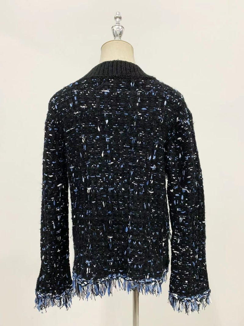 ツイード風のデザイン性高いフリンジニットカーディガンです。