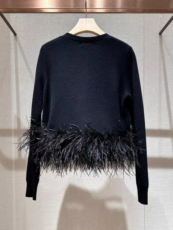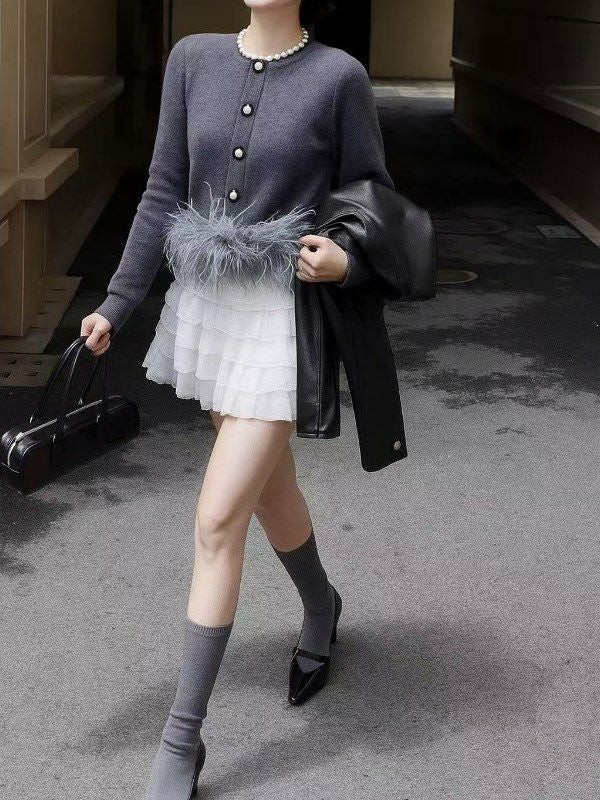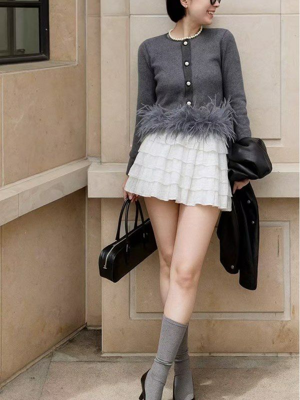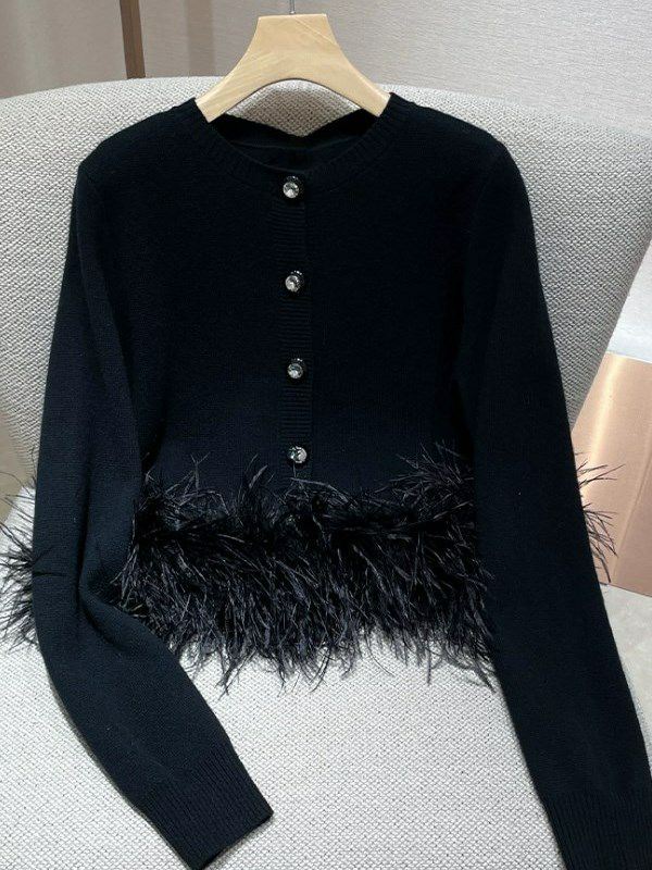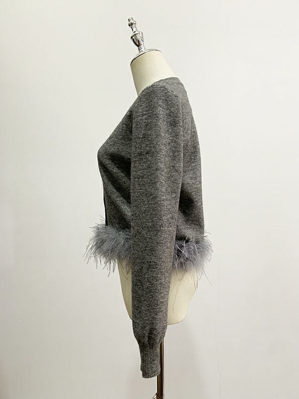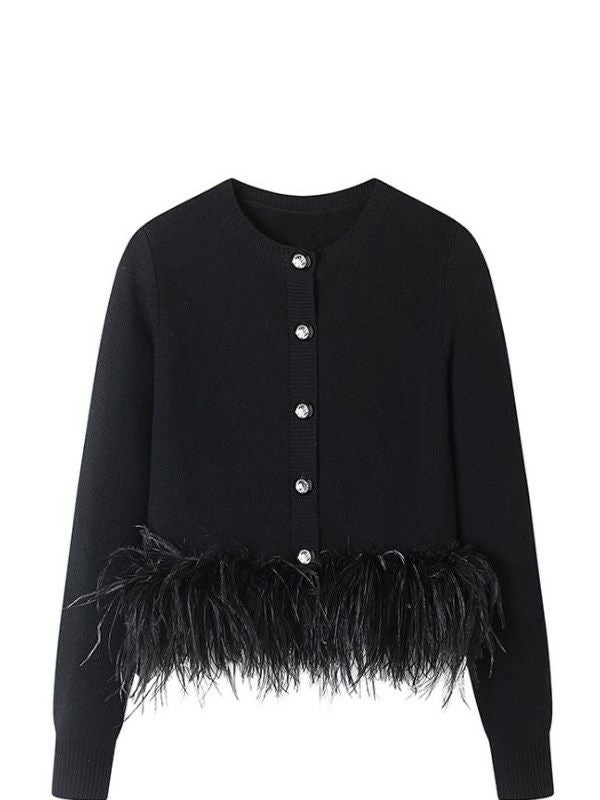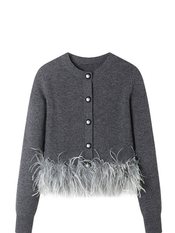 ビジューボタンと裾のフェザーディテールが印象的なニットカーディガン。