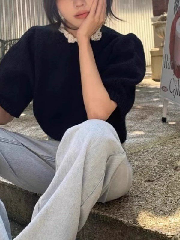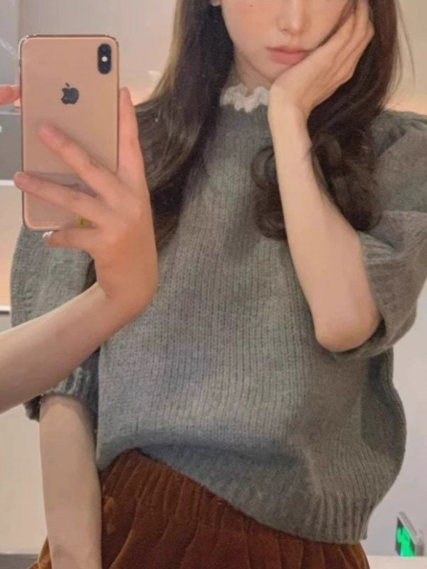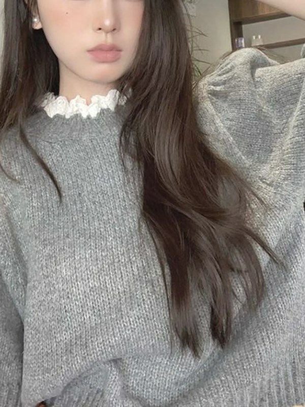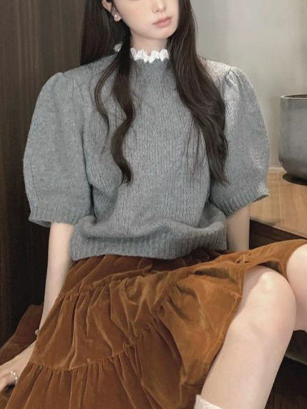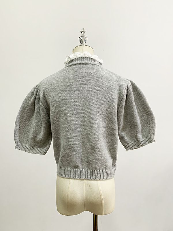襟元にフリルをあしらった、クラシカルなムード漂うニットトップス。