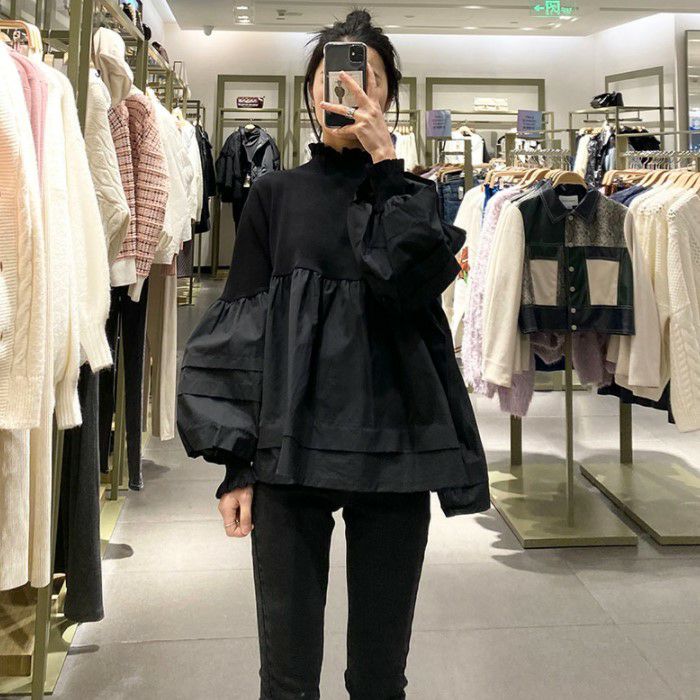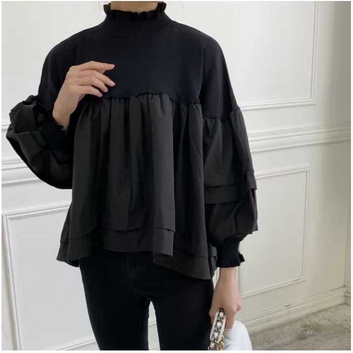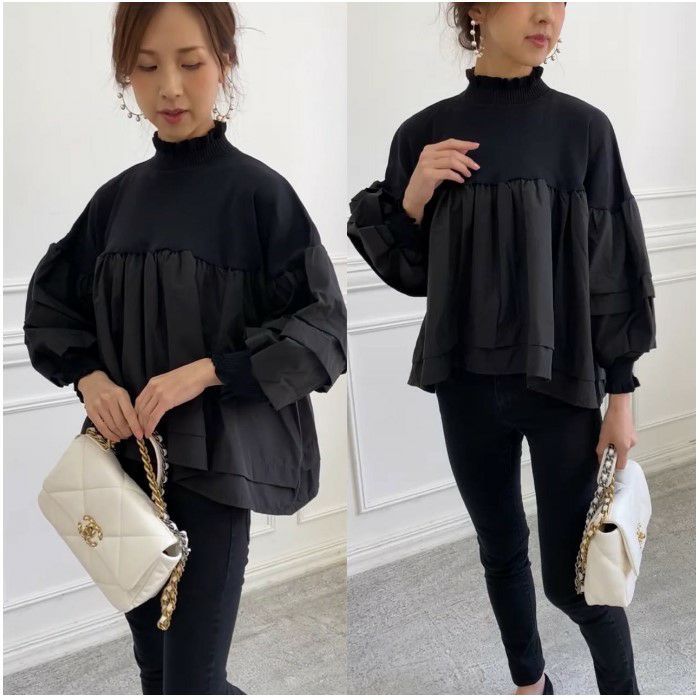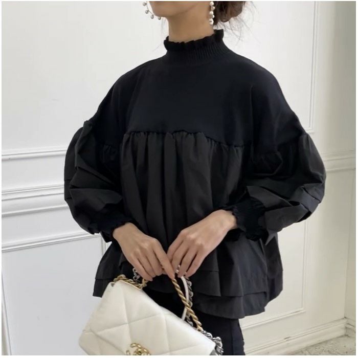 即納 異素材 切り替え フリルカラー プルオーバー トップス