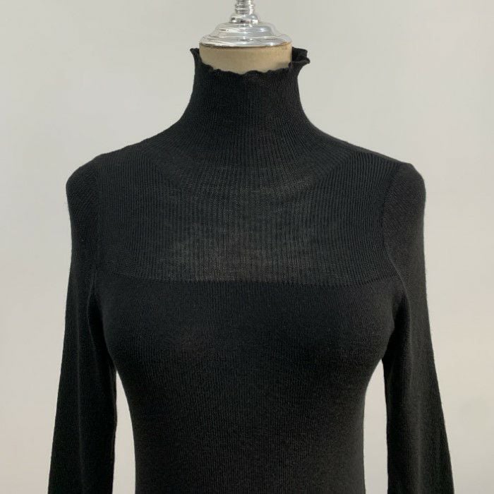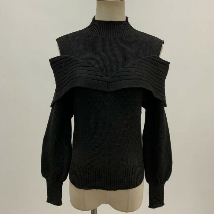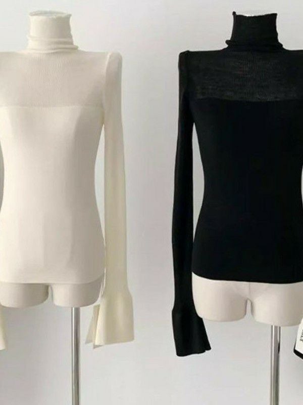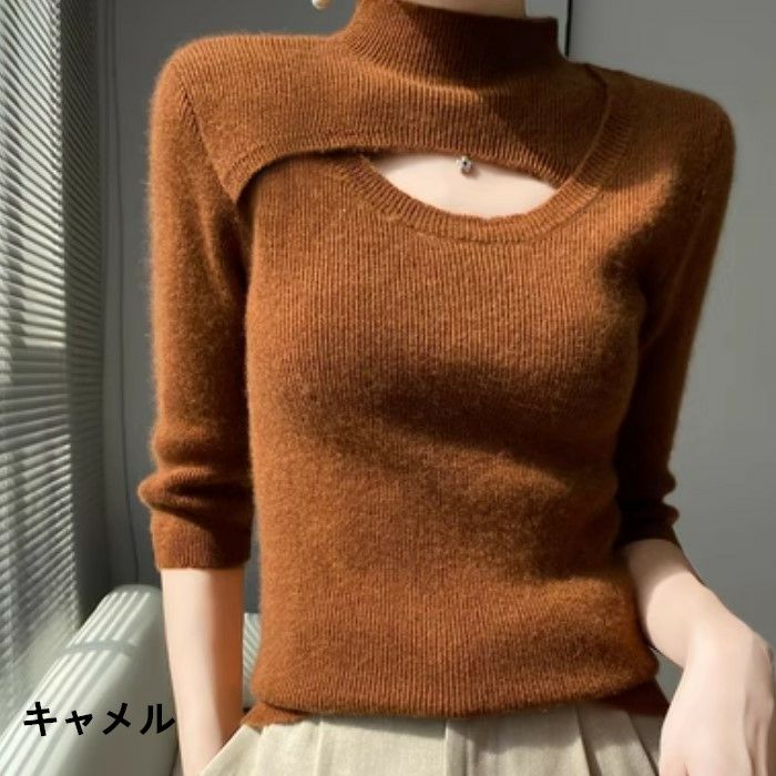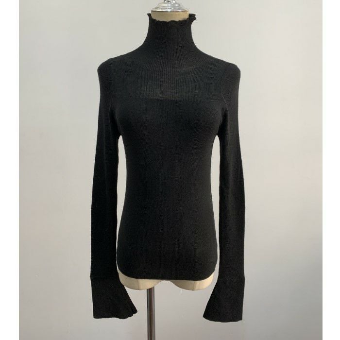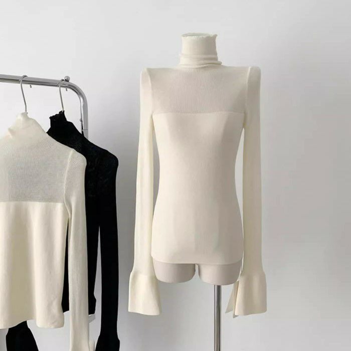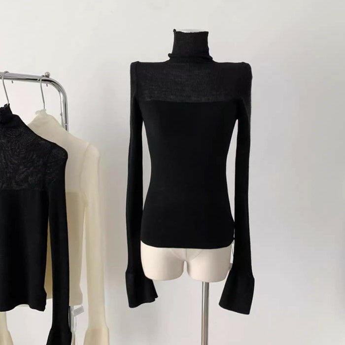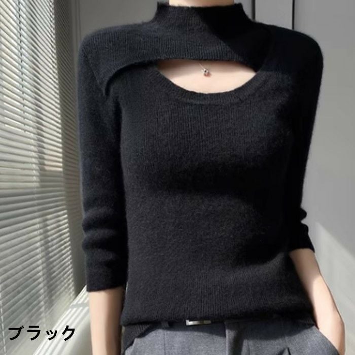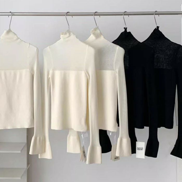 即納 2color シアー デコルテ ハイネック フレア袖 ニット