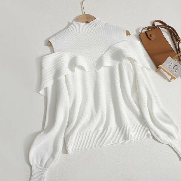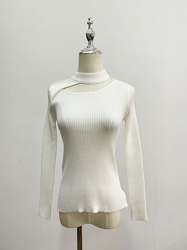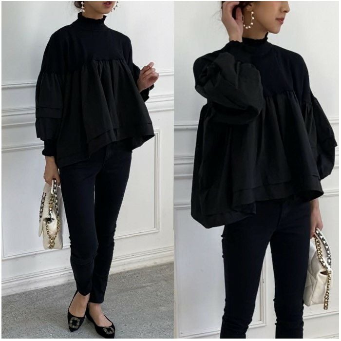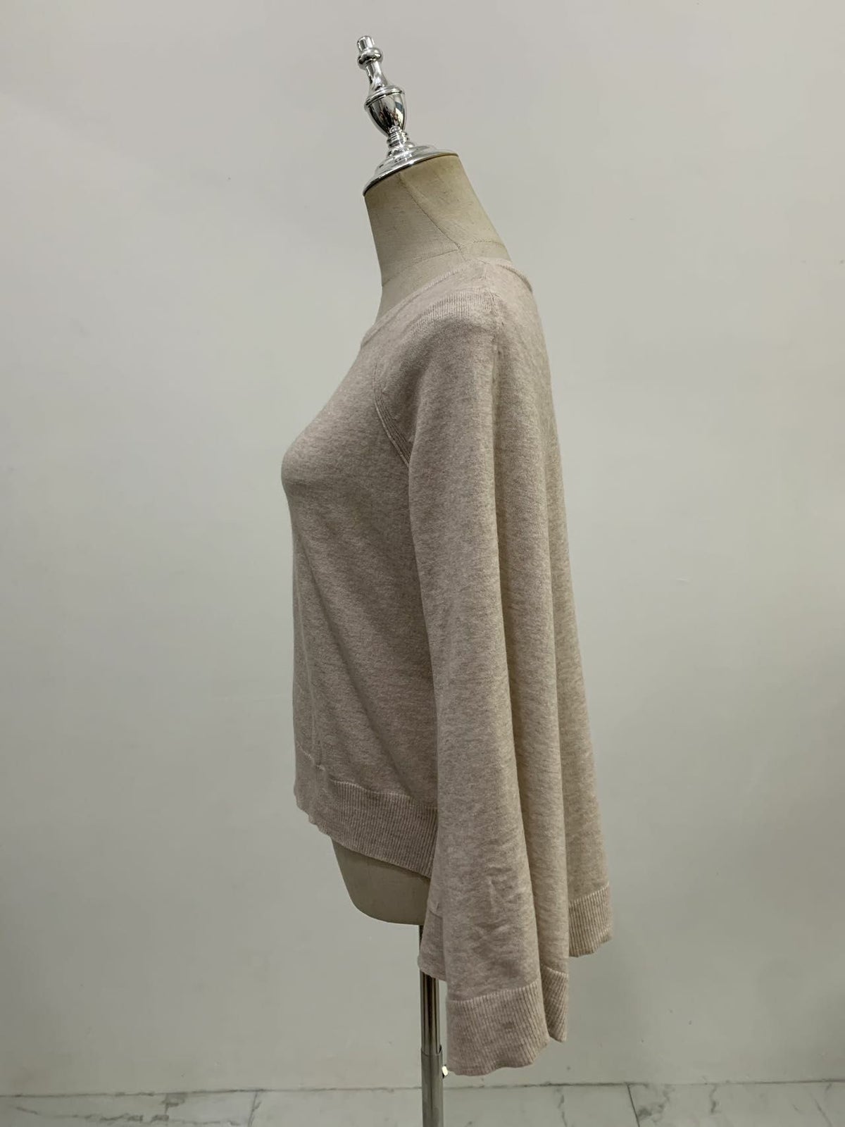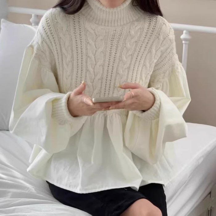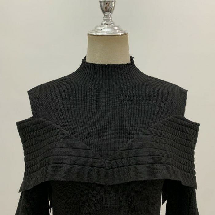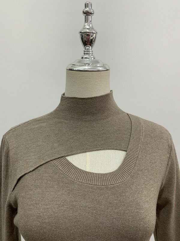 即納 2color シアー デコルテ ハイネック フレア袖 ニット