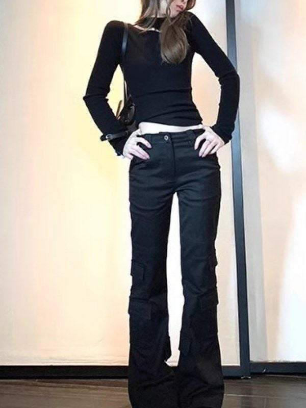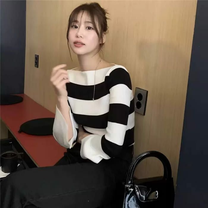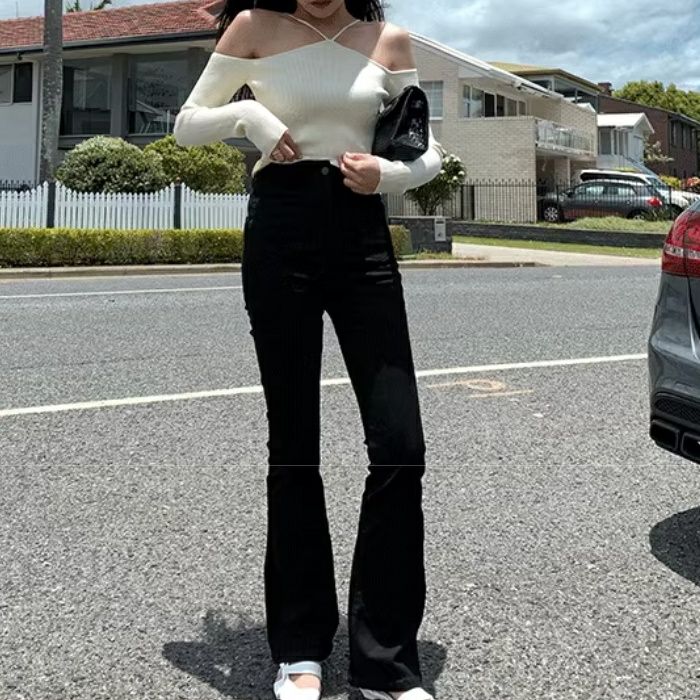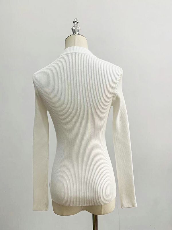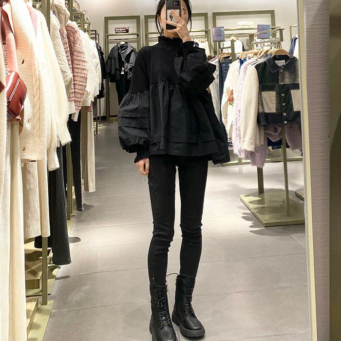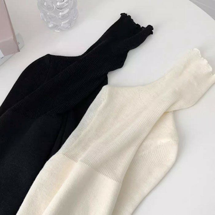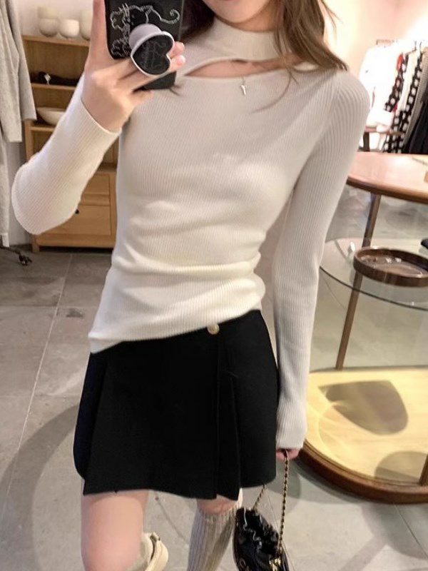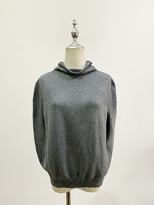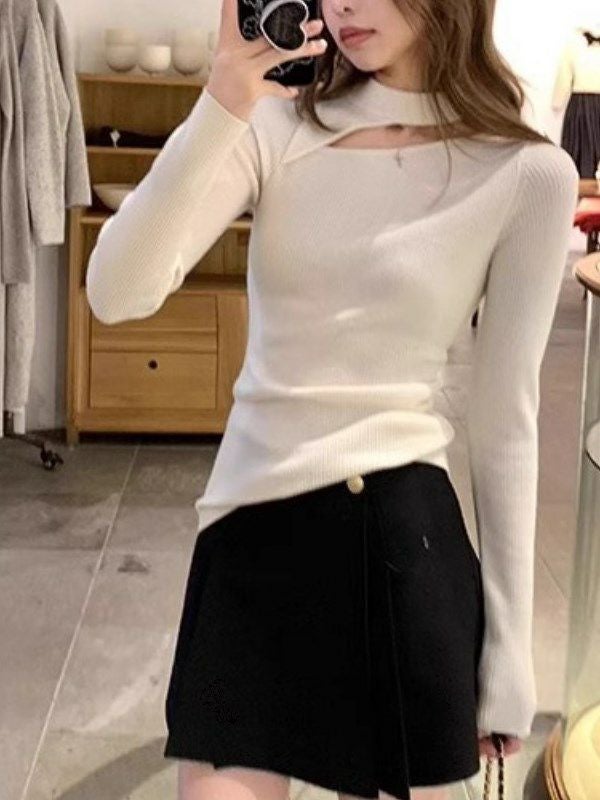 即納 2color シアー デコルテ ハイネック フレア袖 ニット