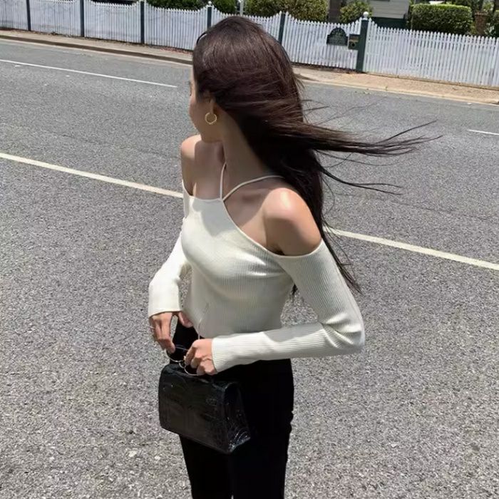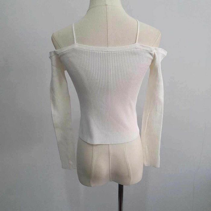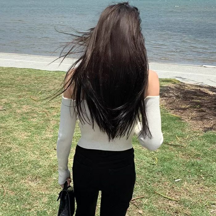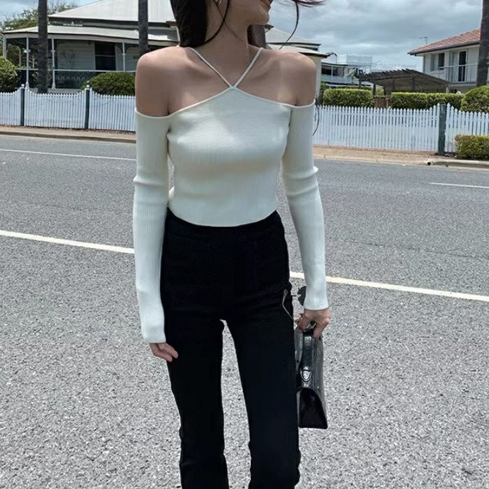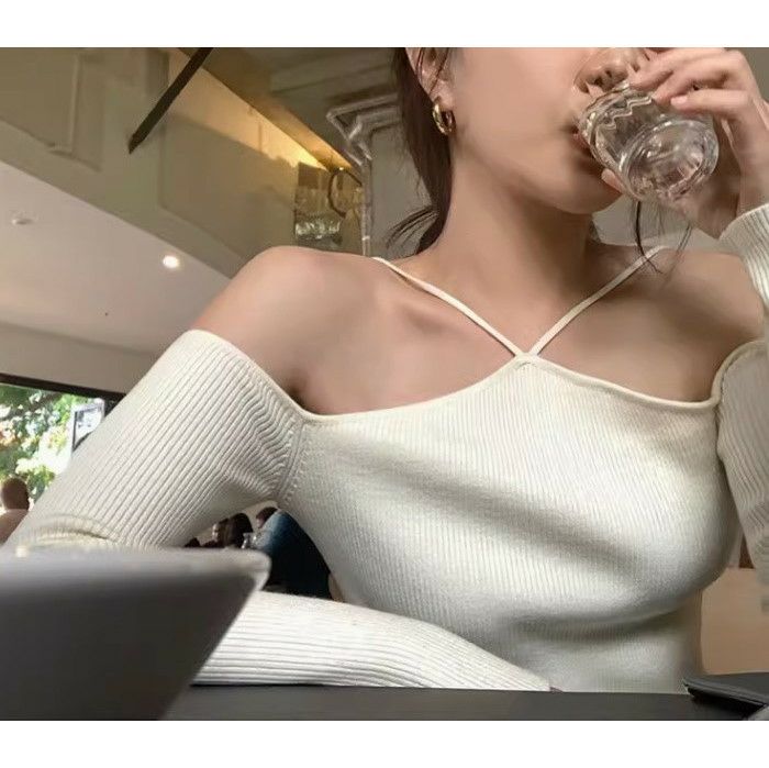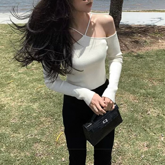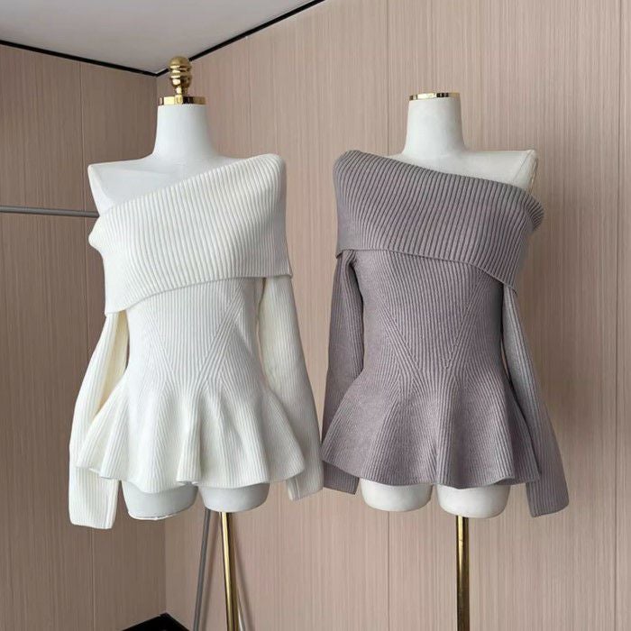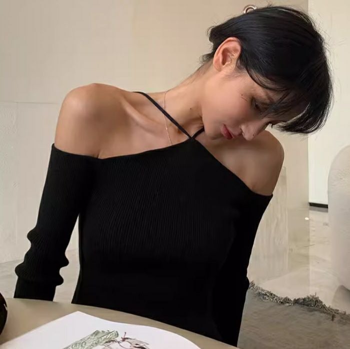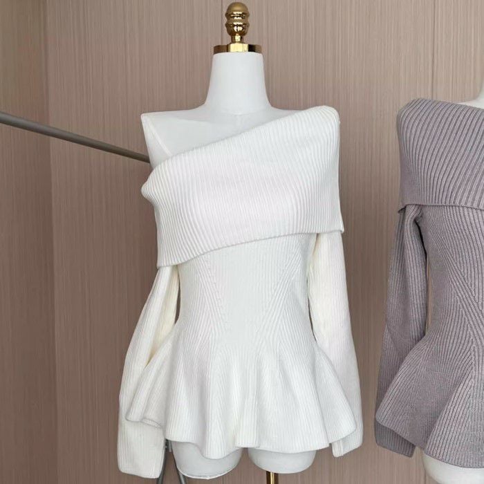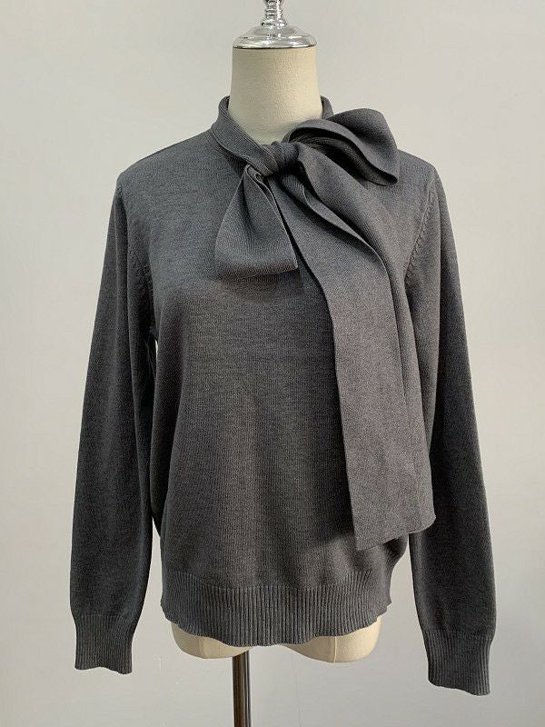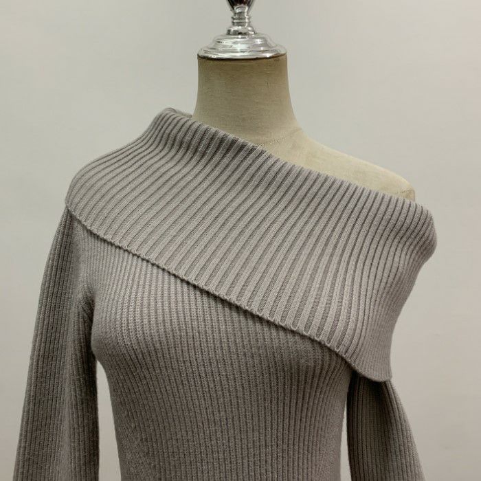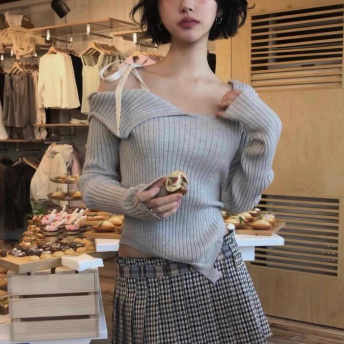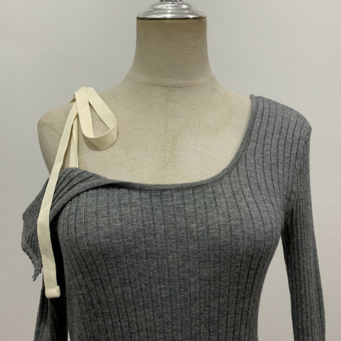予約 オープンショルダー リボン アシンメトリー リブ ニット