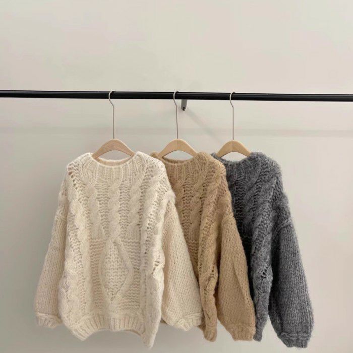 3. 一部即納 3color WOOL オーバーサイズ ケーブル クルーネックニット