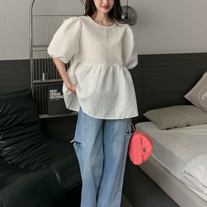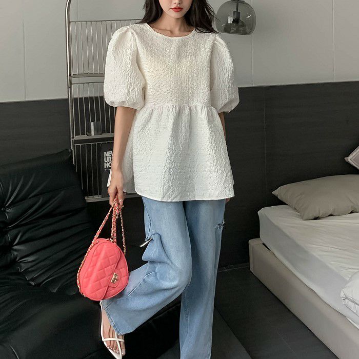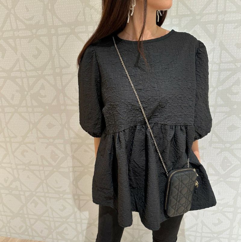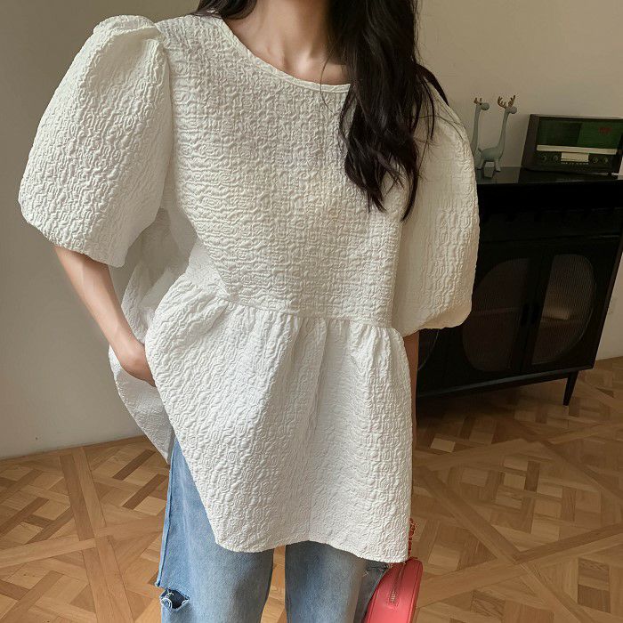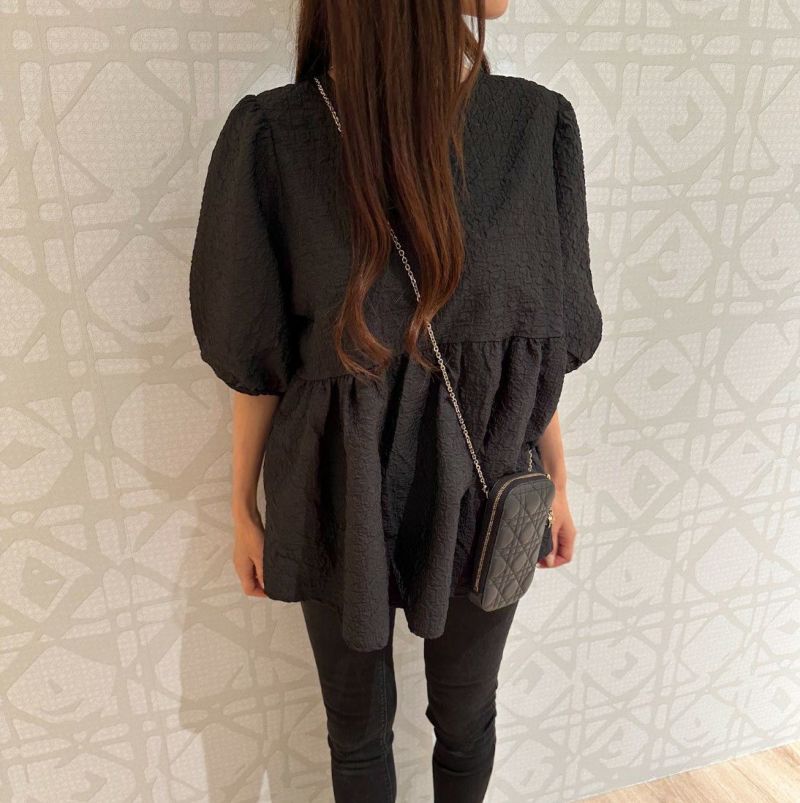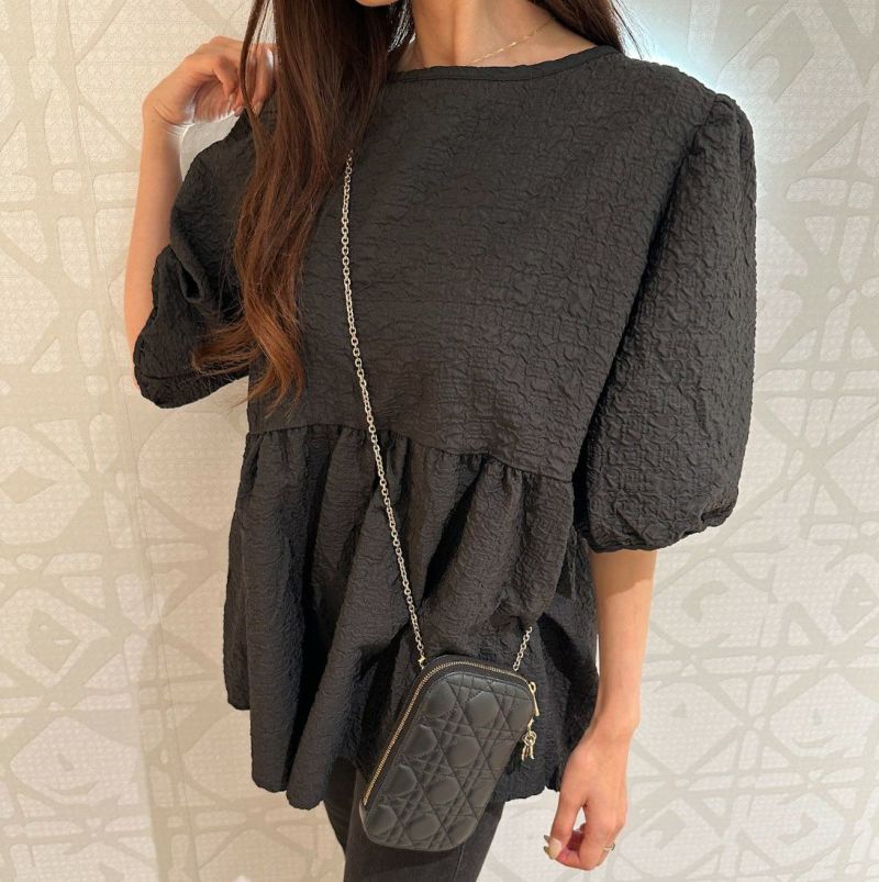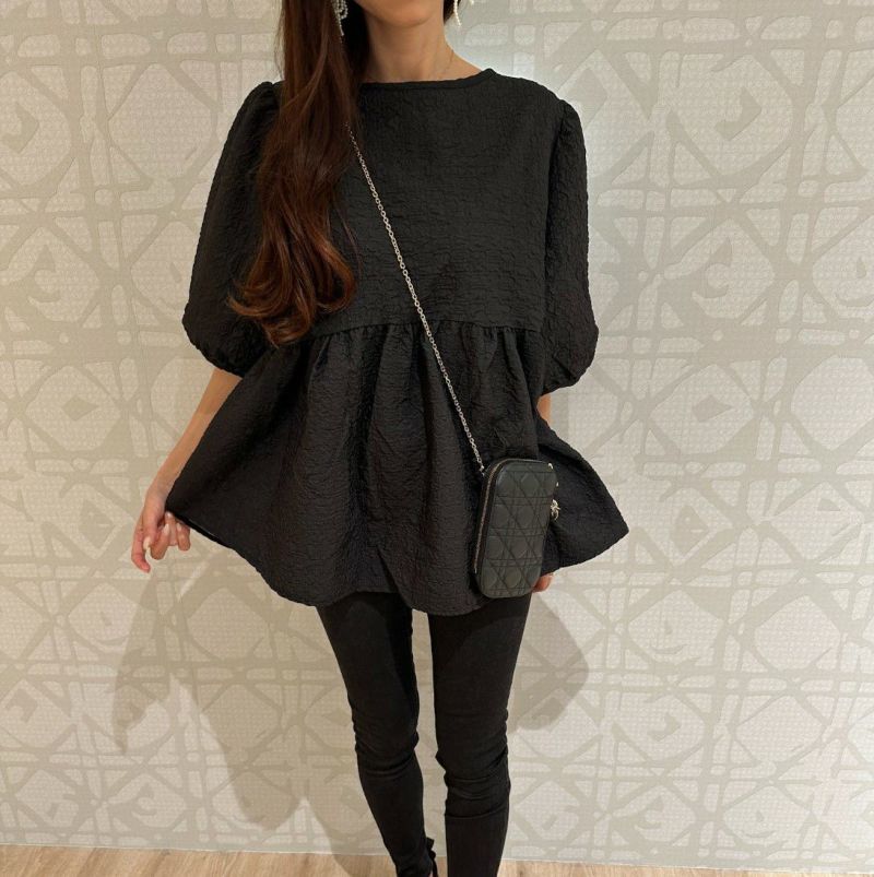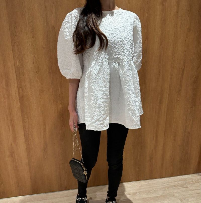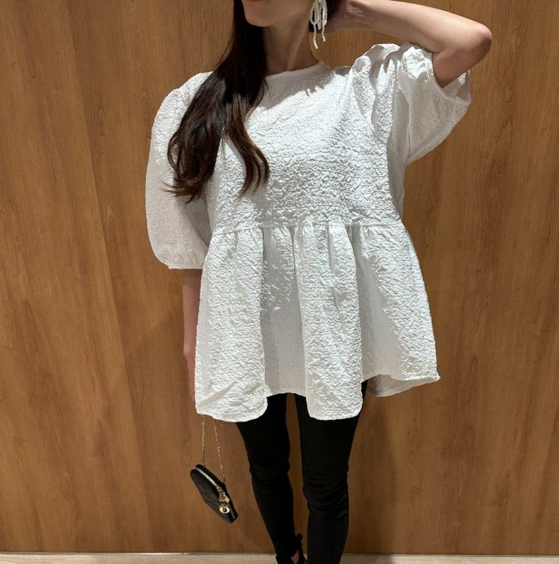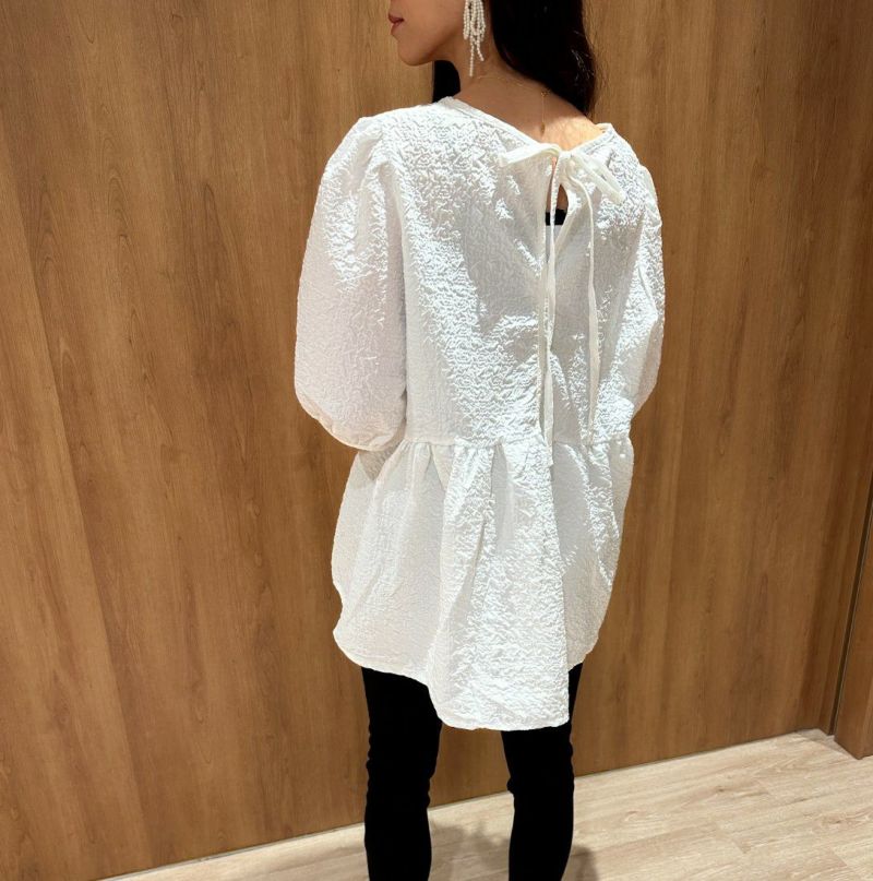一部即納 2color ふくれジャガード パフスリーブ ペプラム プルオーバー