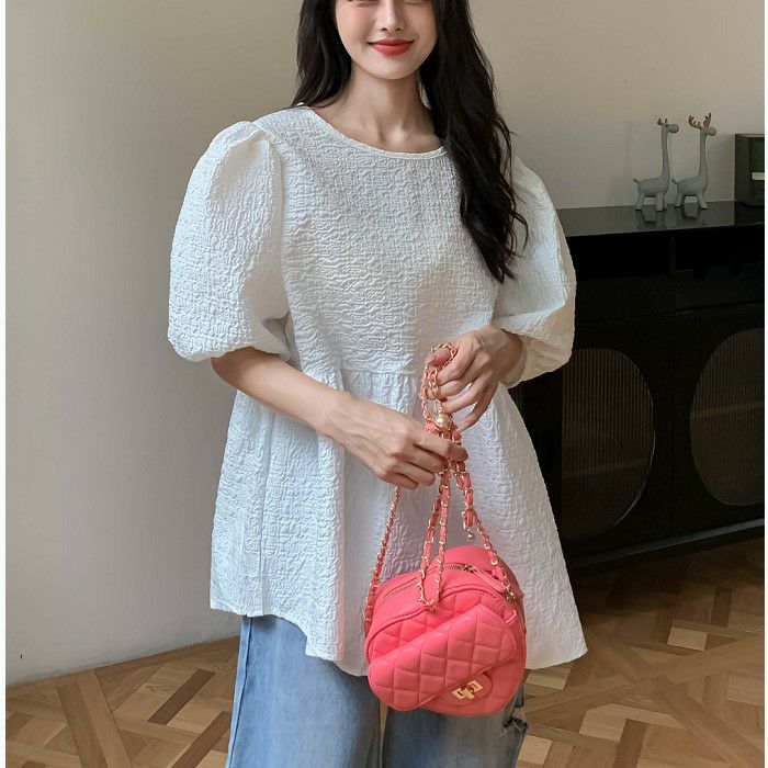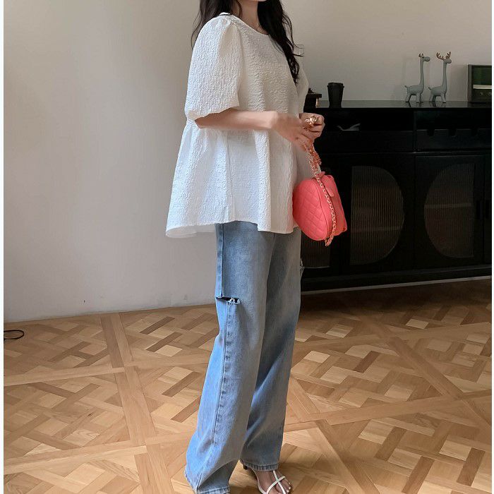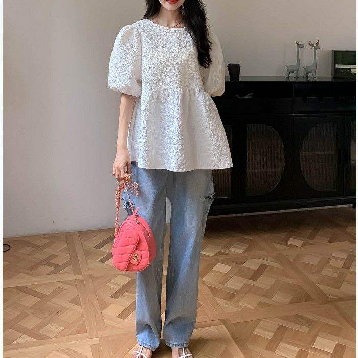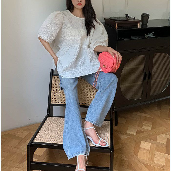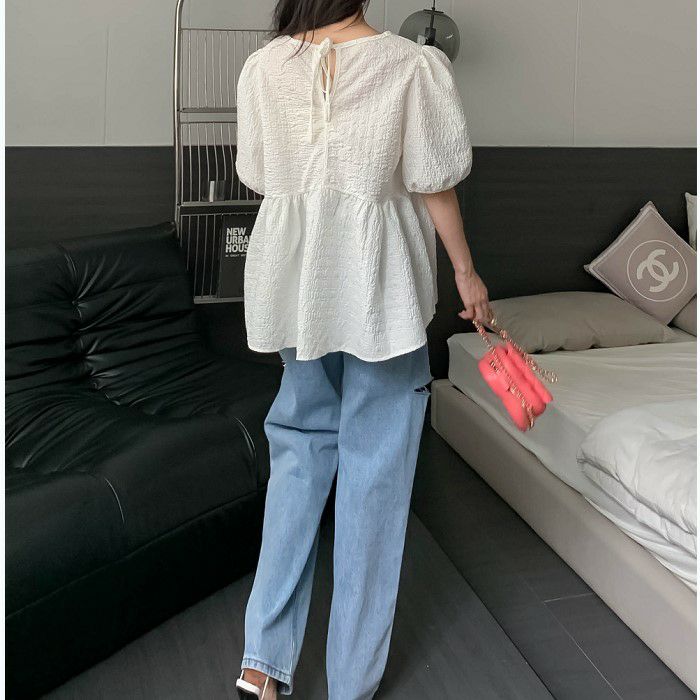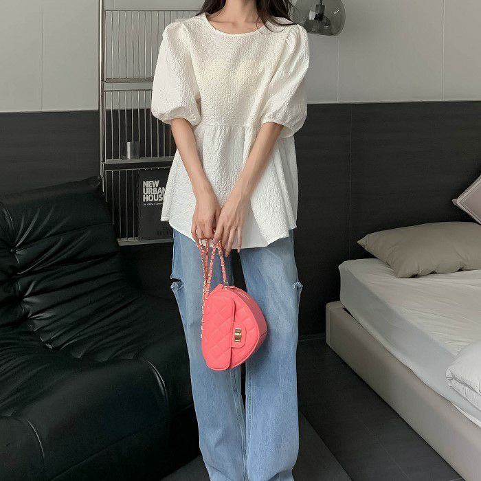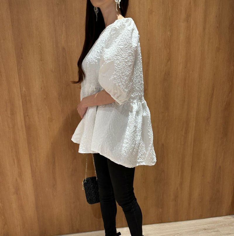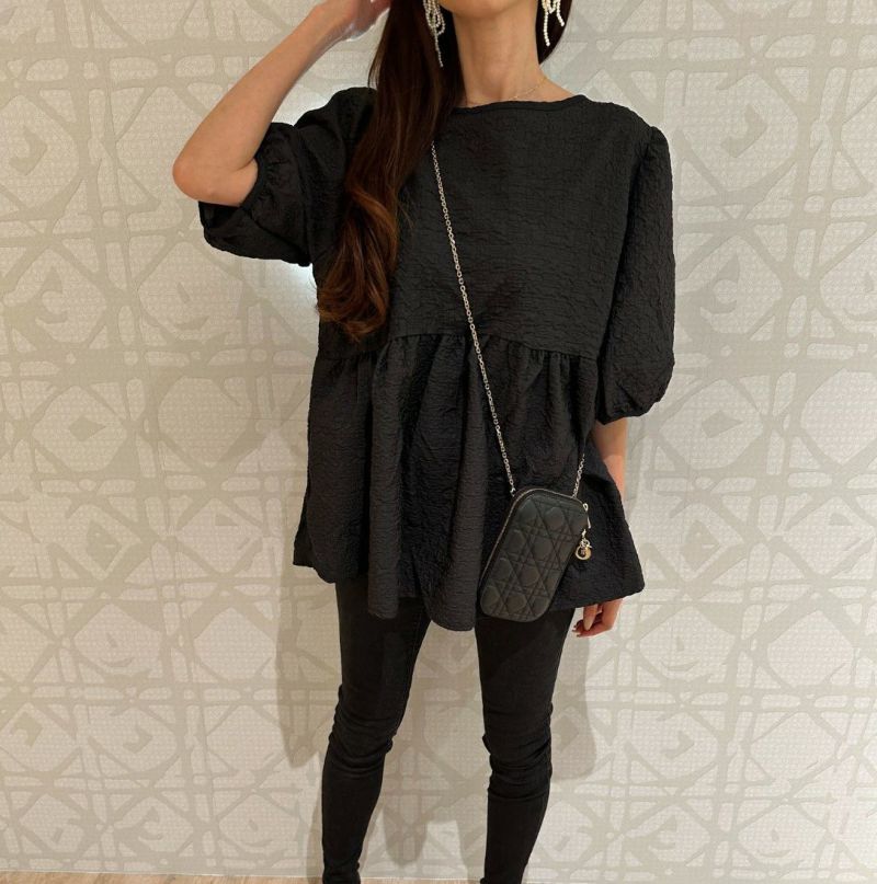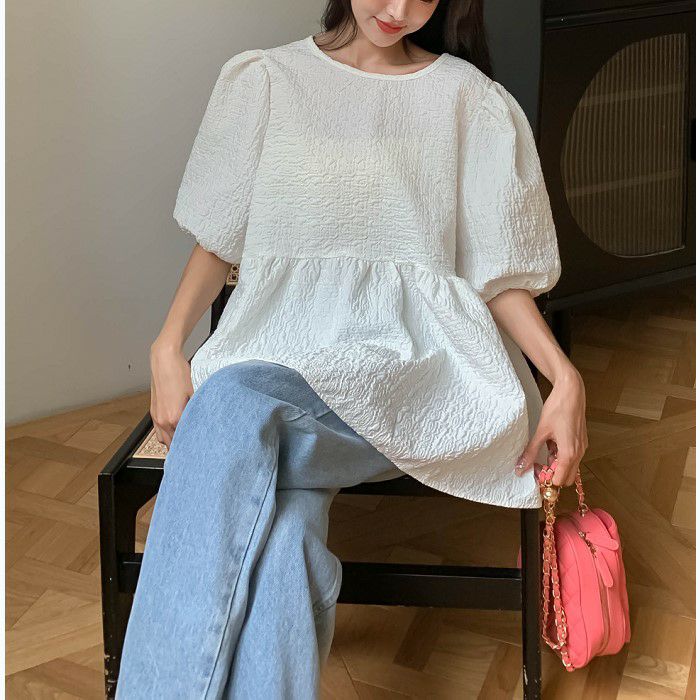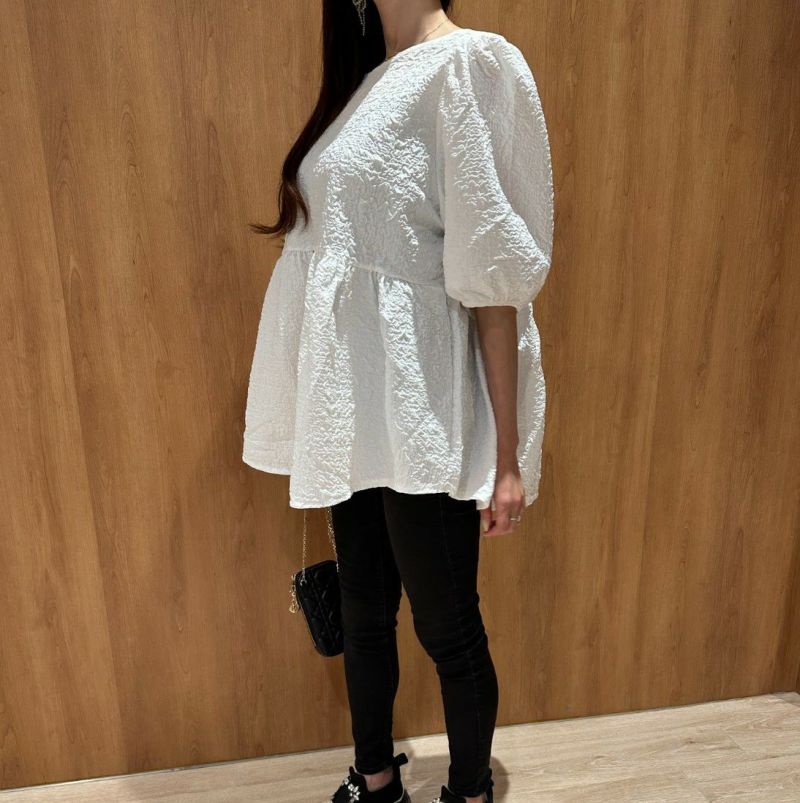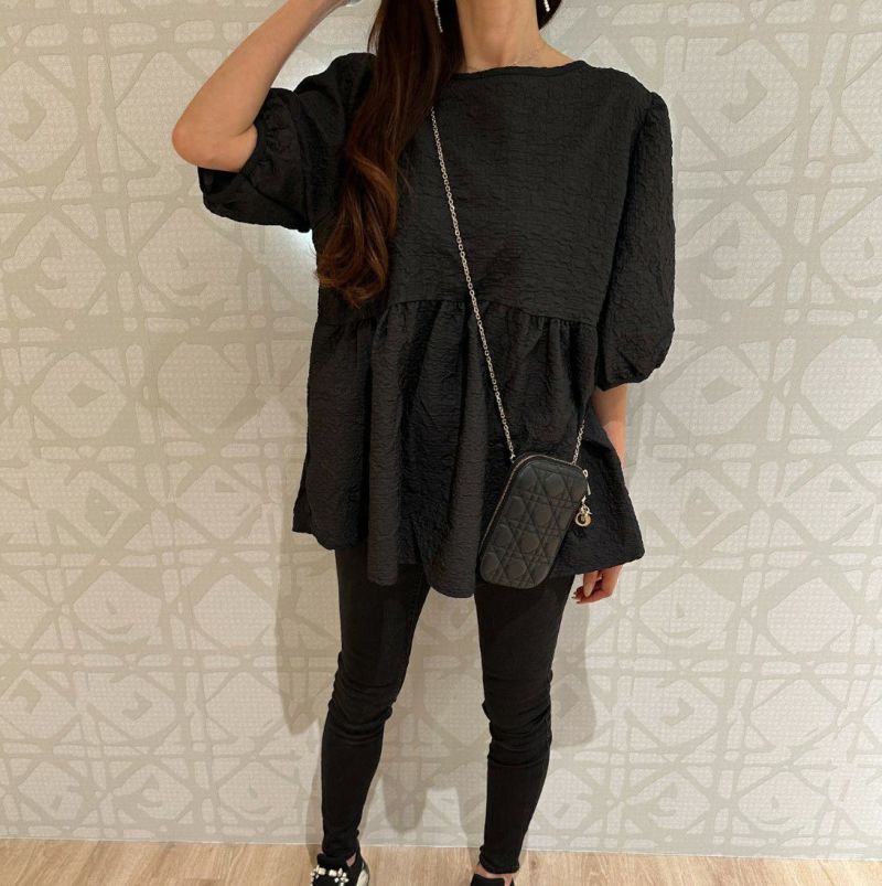 一部即納 2color ふくれジャガード パフスリーブ ペプラム プルオーバー