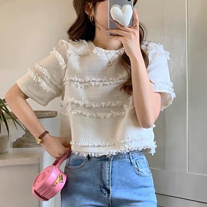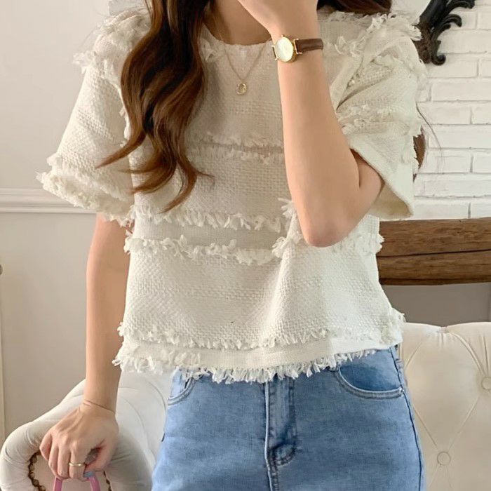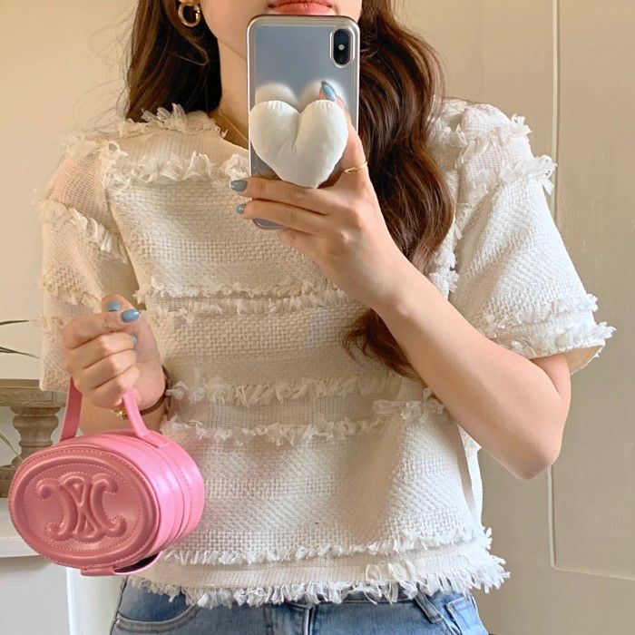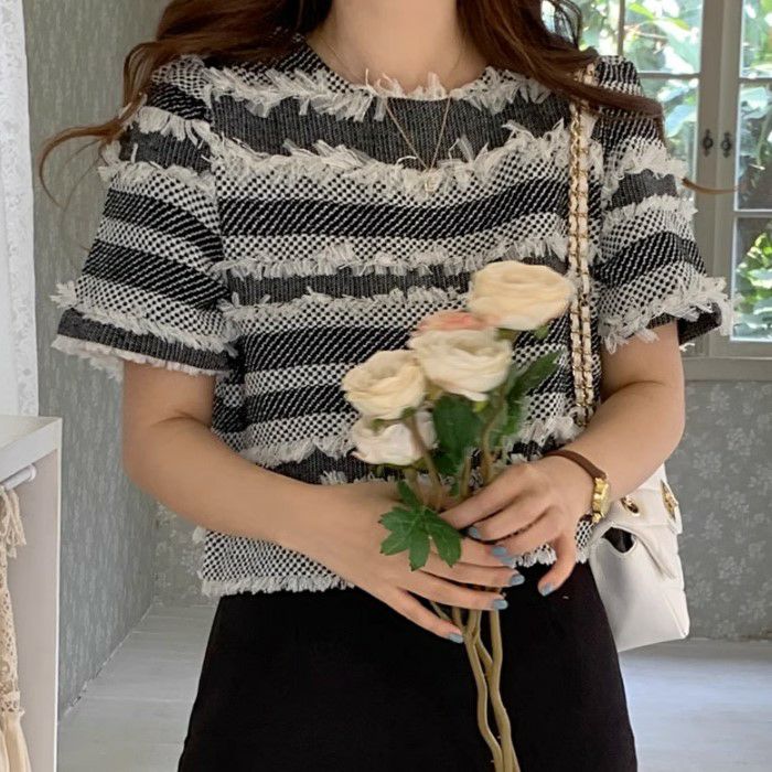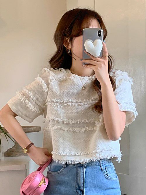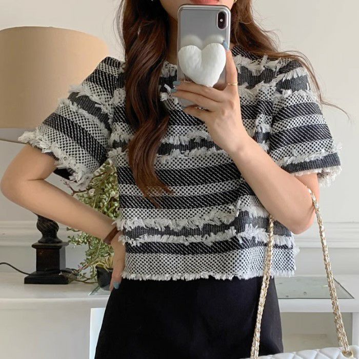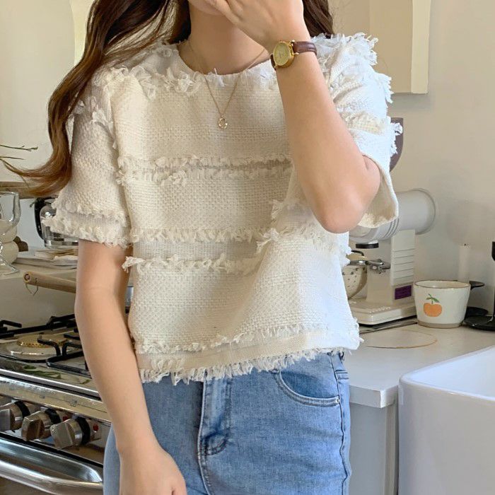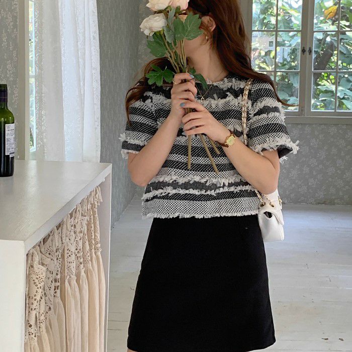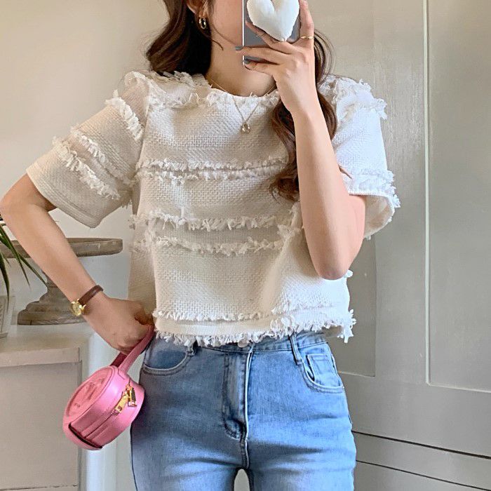 予約 2color フリンジ ボーダー ハーフスリーブ プルオーバー