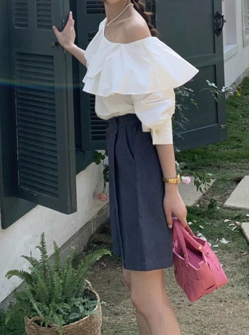 予約 2color フリル レイヤード アシンメトリー オフショルダー トップス