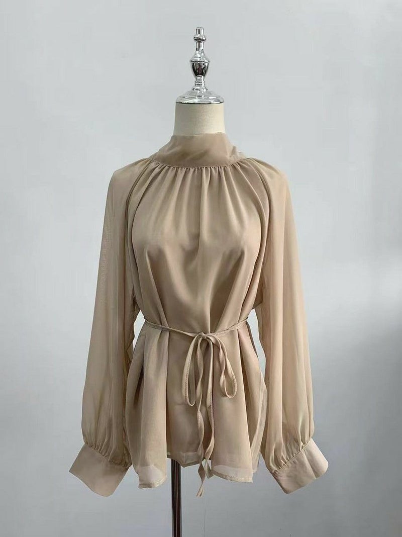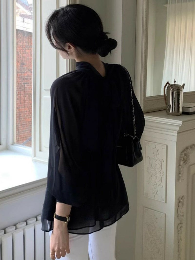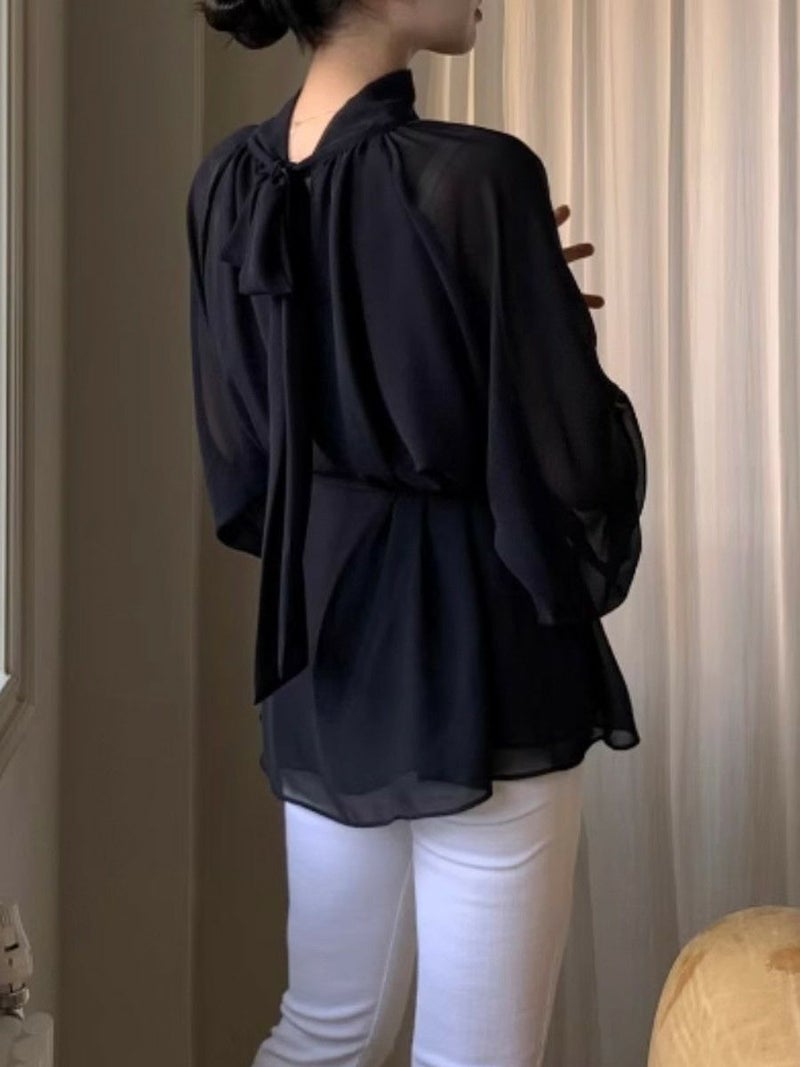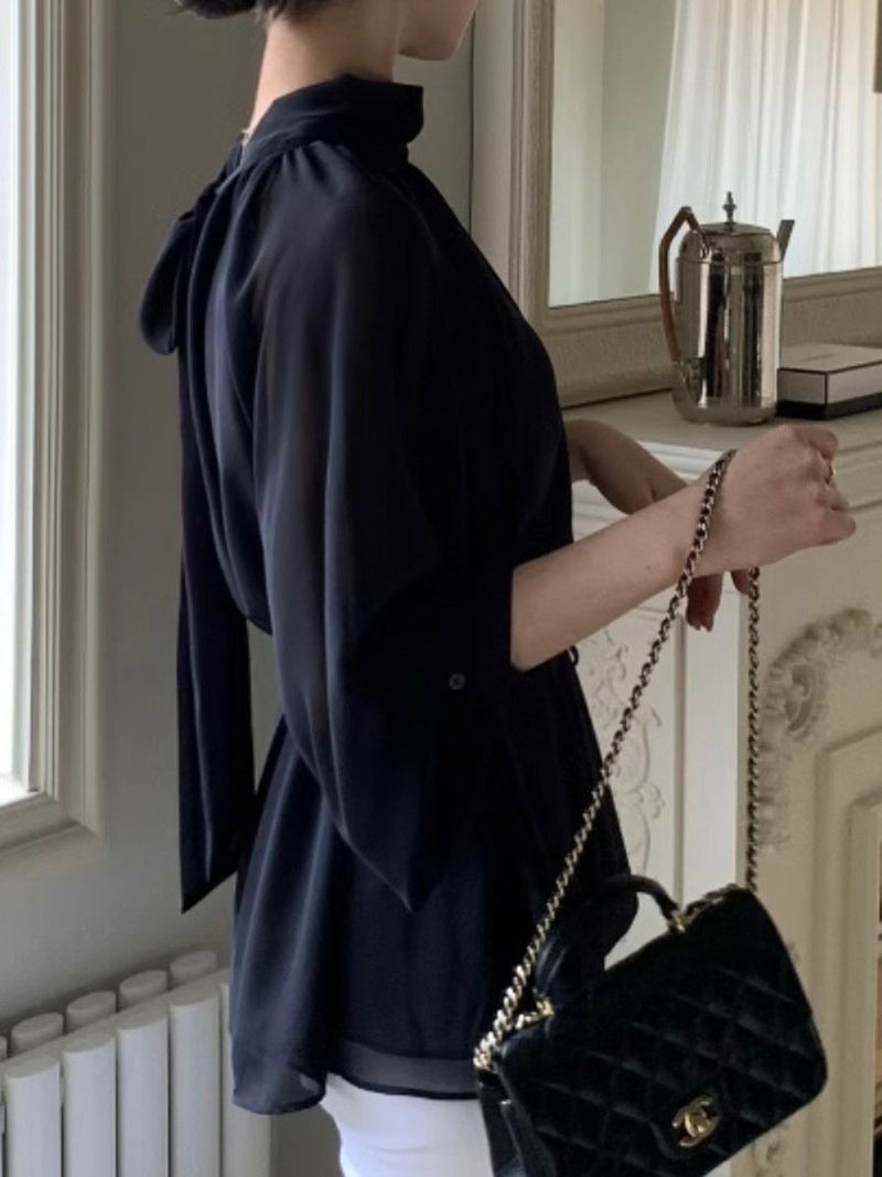 4. 予約 2color シアー シフォン ボウタイ トップス