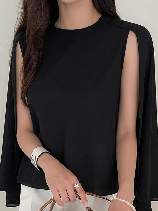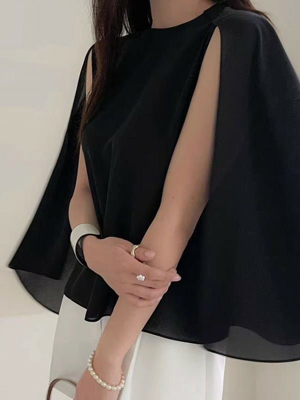 エレガントなケープ調デザインが魅力のクルーネックトップスです。
