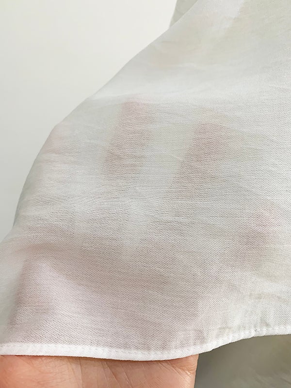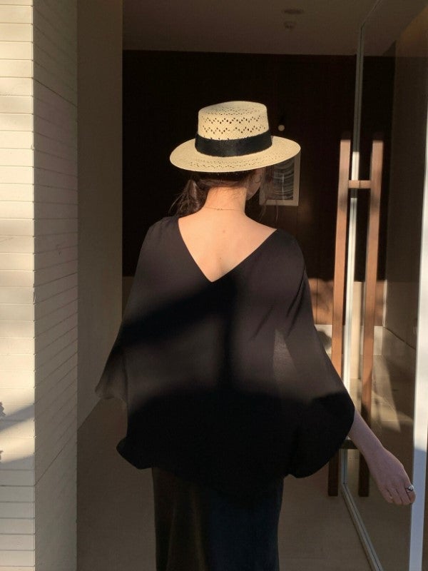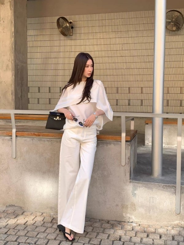 パンツはゆとりのあるワイドシルエットで、脚のラインを拾わずリラックス感のある穿き心地。