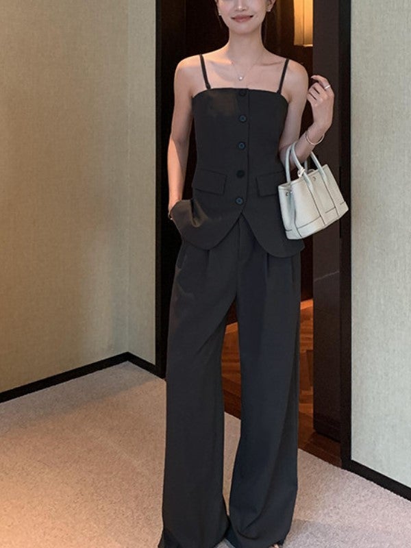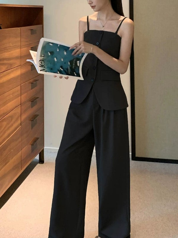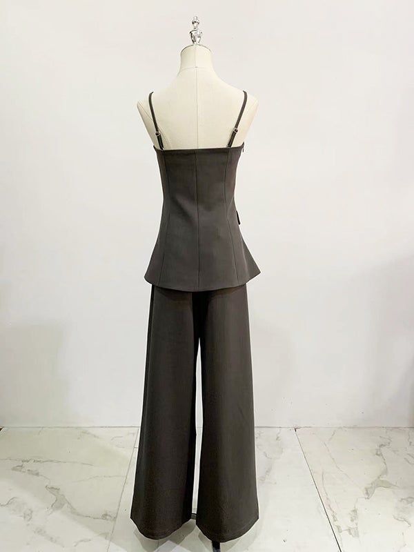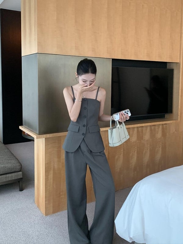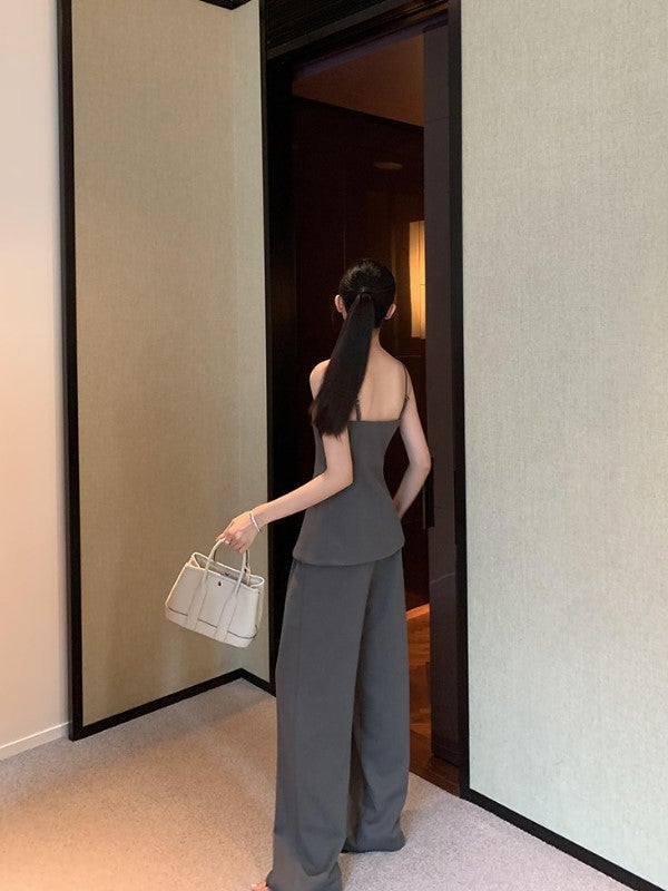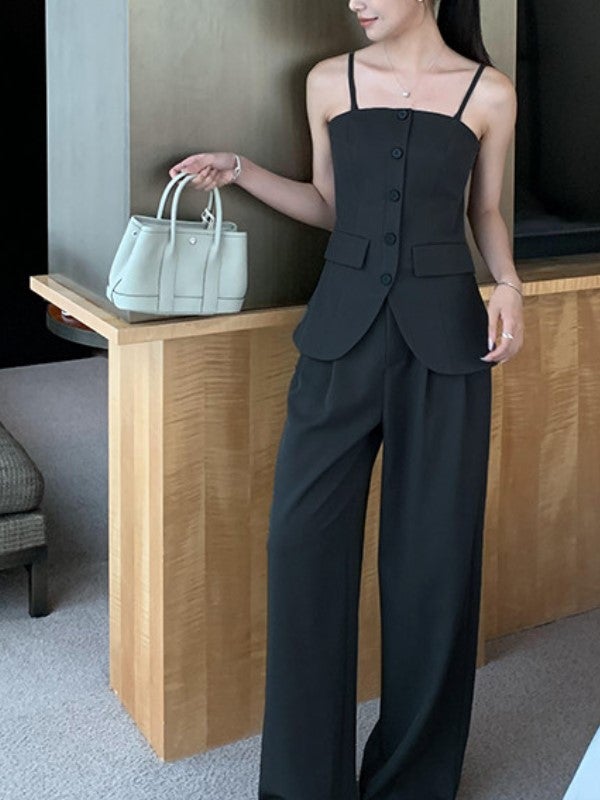 美しいウエストラインを引き立てる、キャミビスチェとワイドパンツのセットアップ。