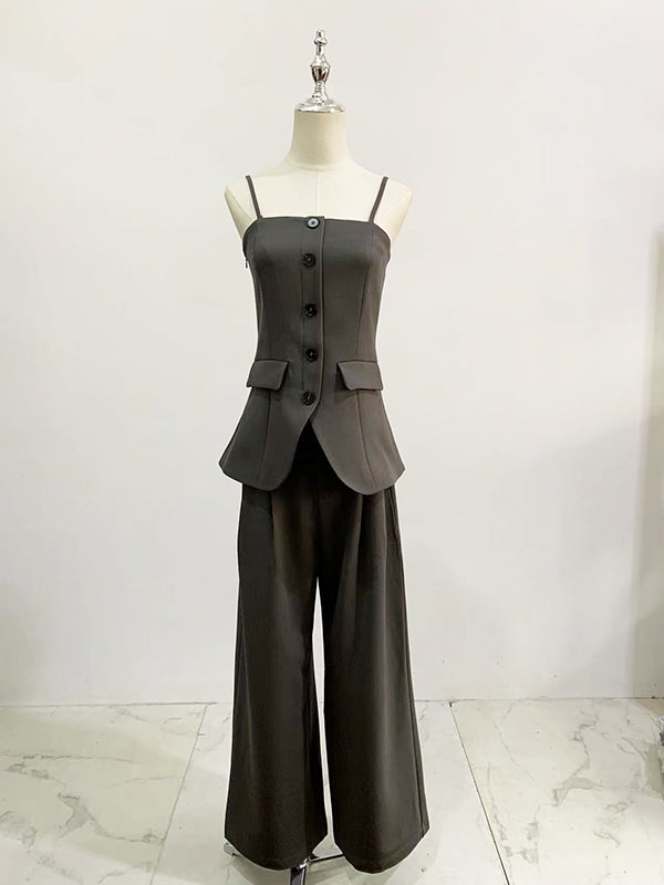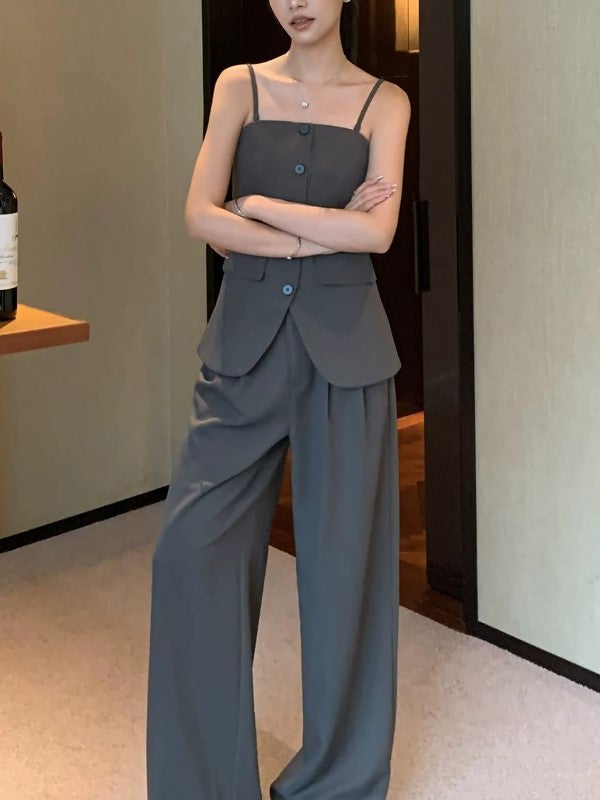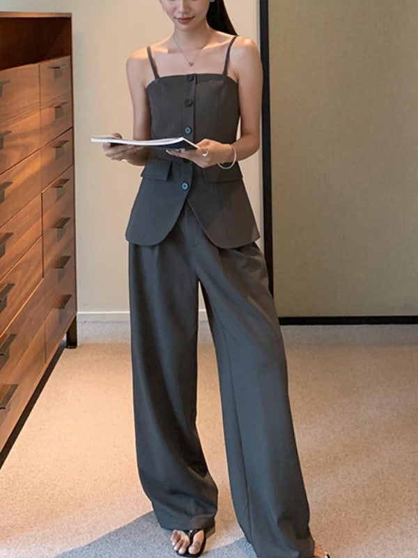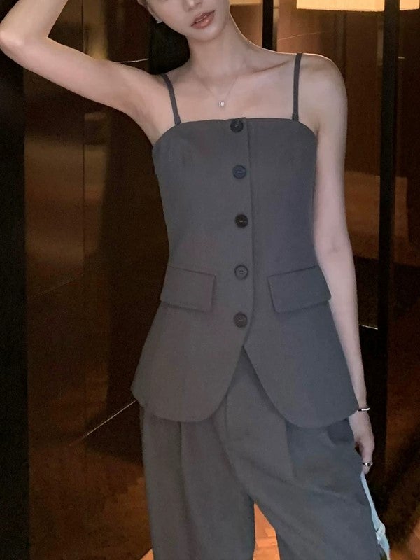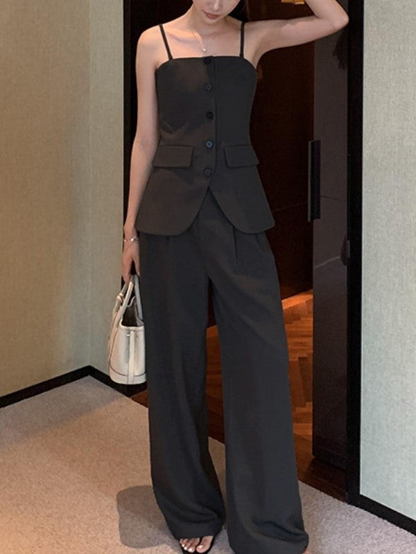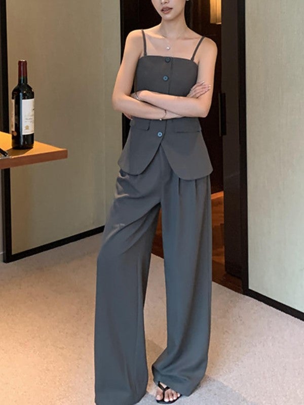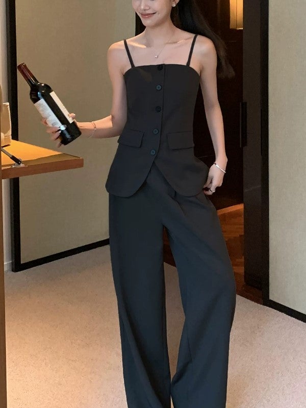 美しいウエストラインを引き立てる、キャミビスチェとワイドパンツのセットアップ。