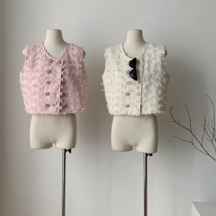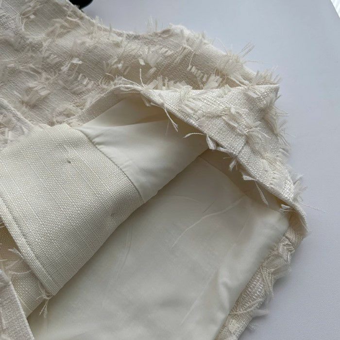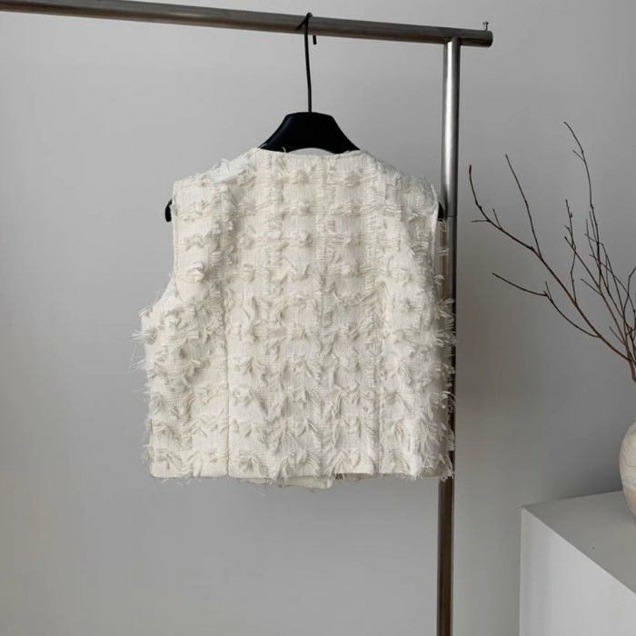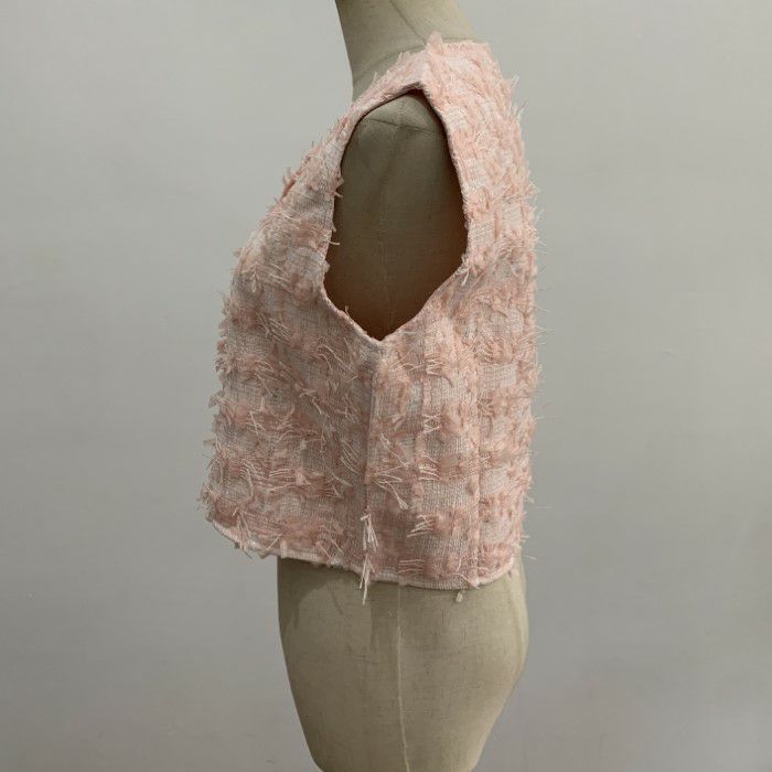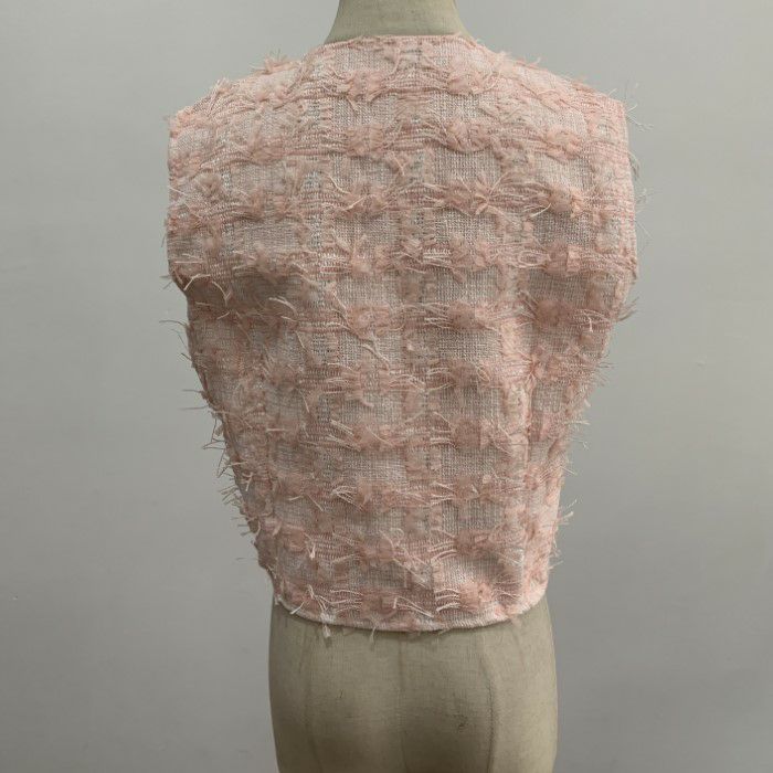 フェザー調の生地が今期らしく可愛いミニマルな丈のジレ