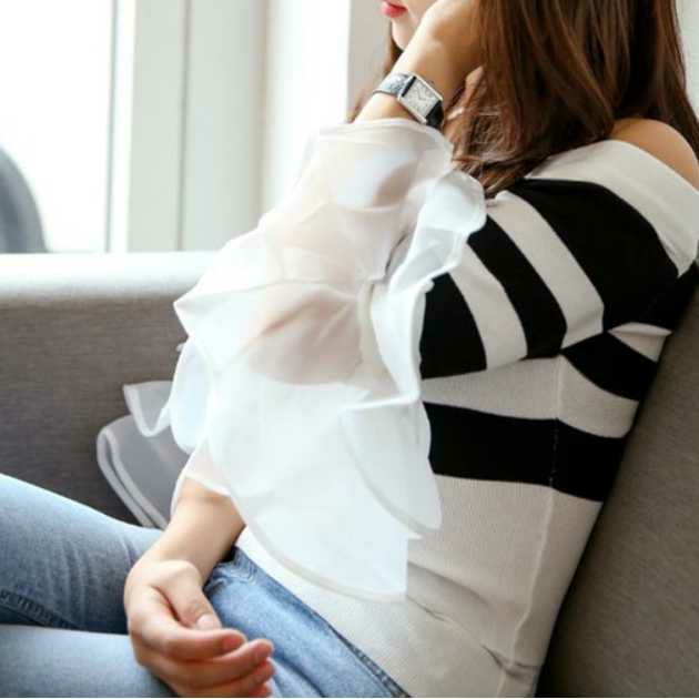 予約 9color オーガンジー フリル 袖 オフショルダー ニット