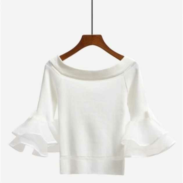 ハリのあるフリルの袖が可愛い オフショルダー ニット