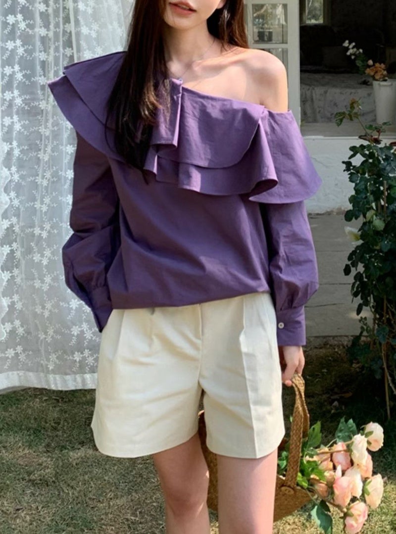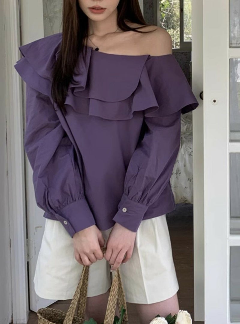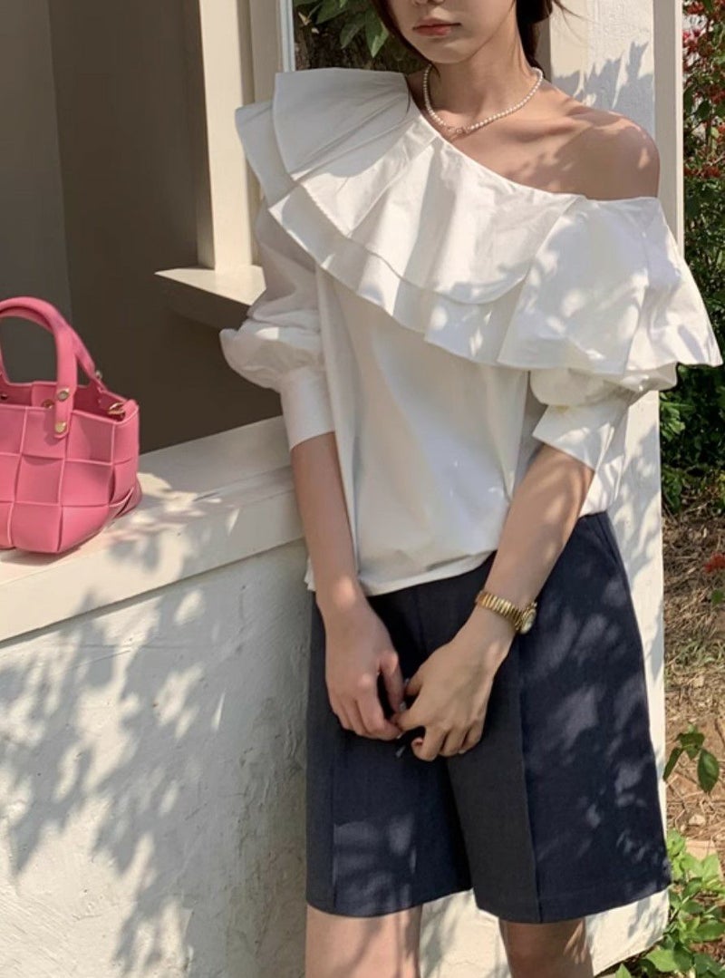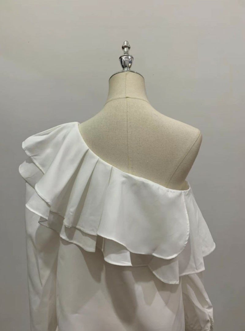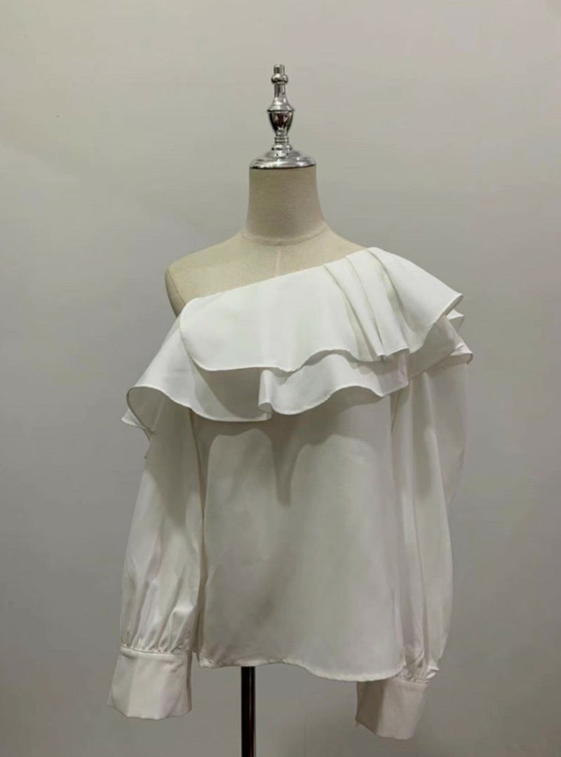 予約 2color フリル レイヤード アシンメトリー オフショルダー トップス