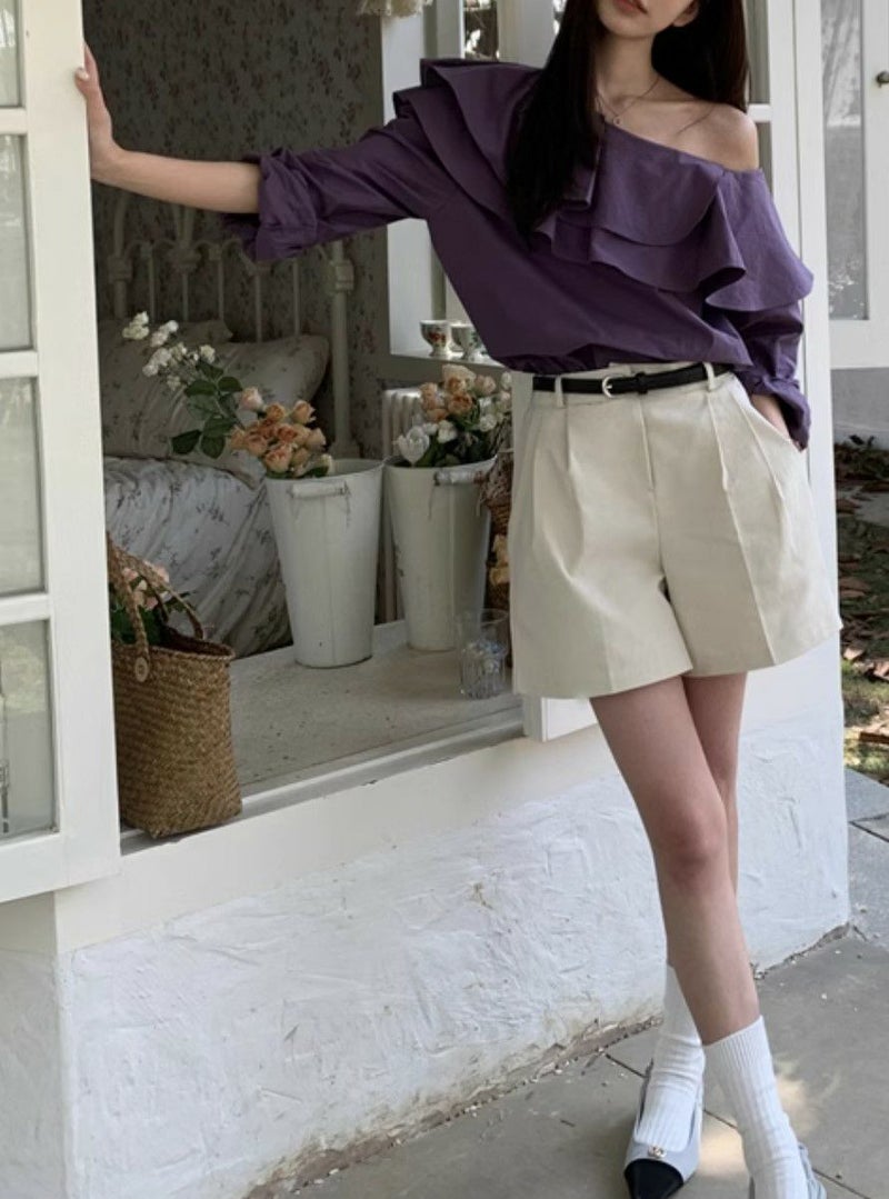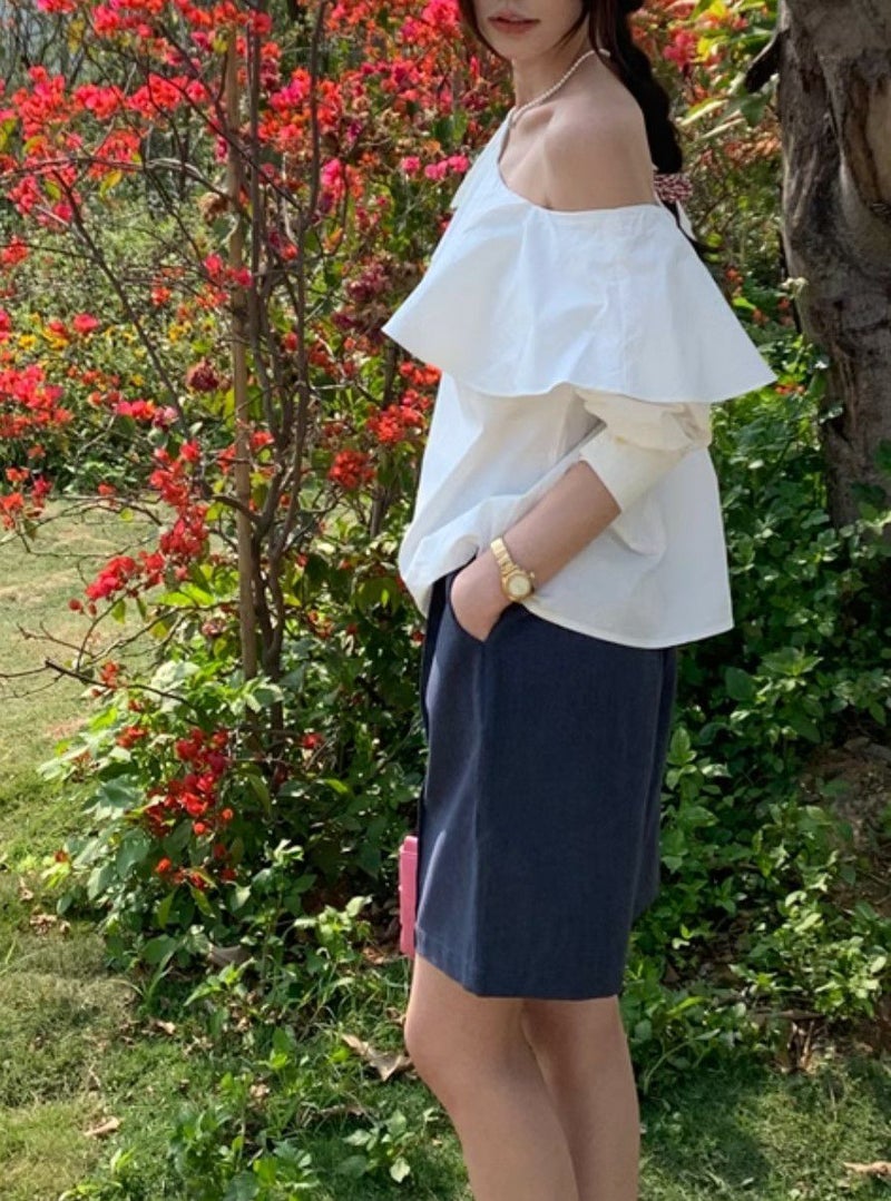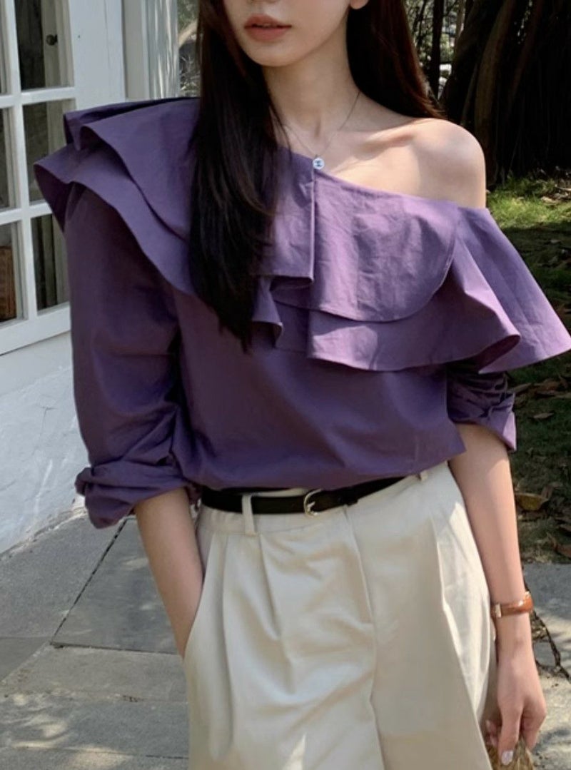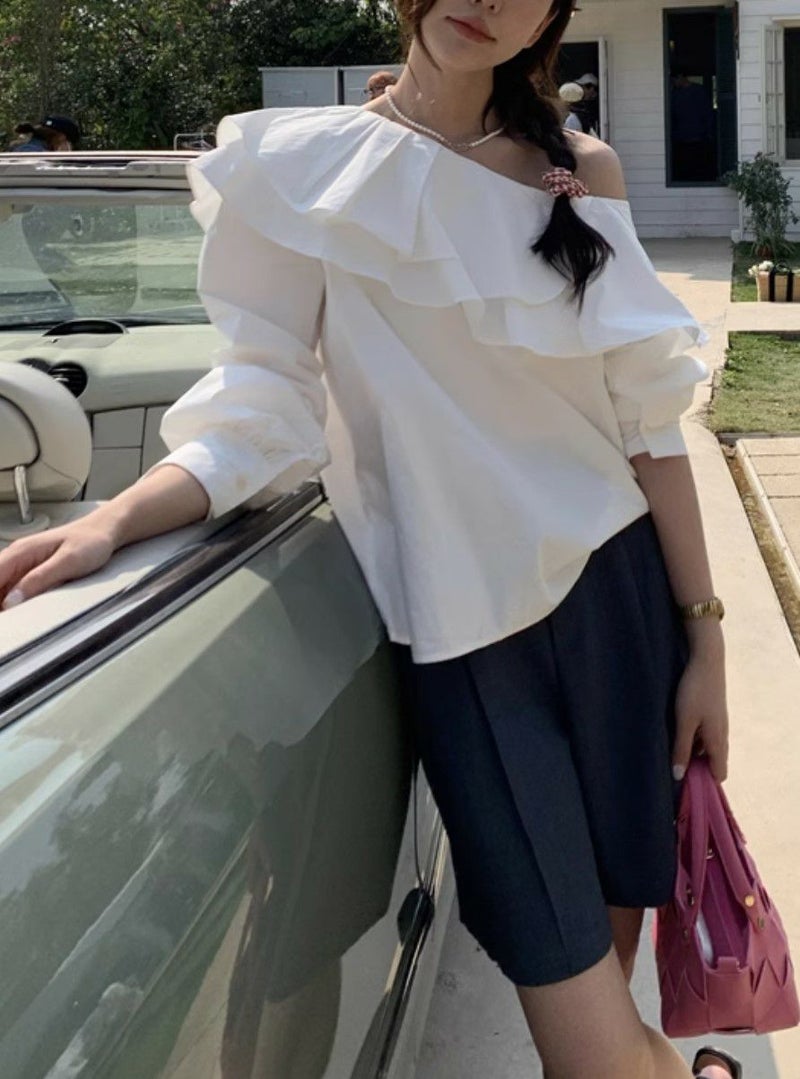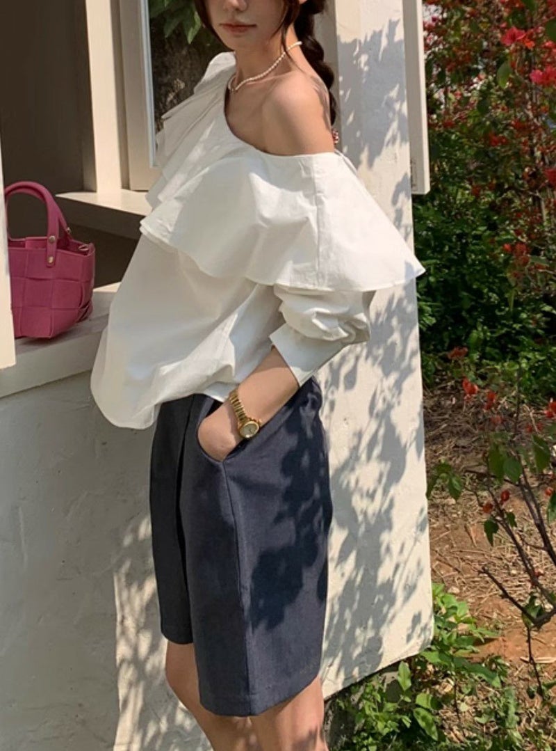 予約 2color フリル レイヤード アシンメトリー オフショルダー トップス