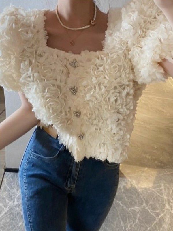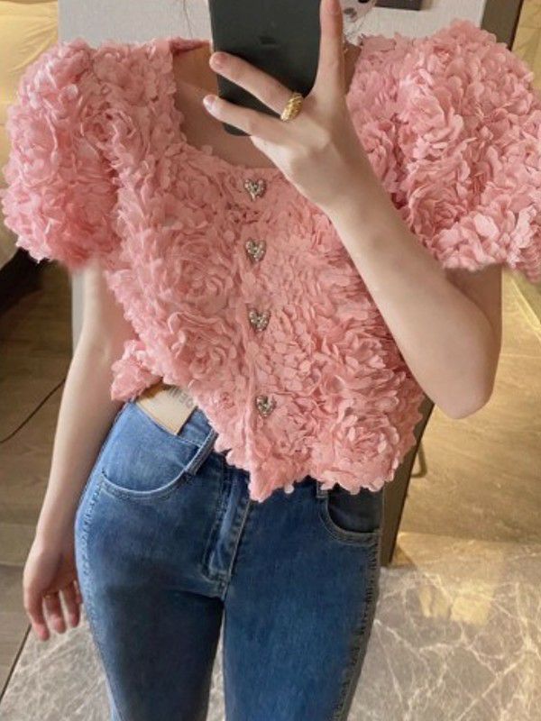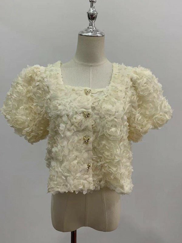 予約 3color 立体フラワー素材 スクエアネック トップス