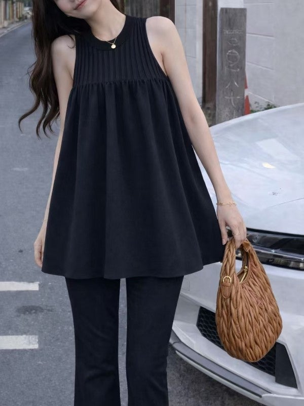 予約 ノースリーブ リブ クルーネック チュニック ニット