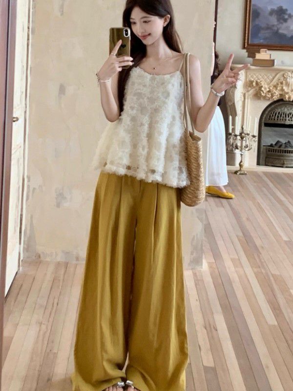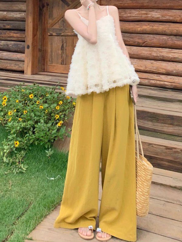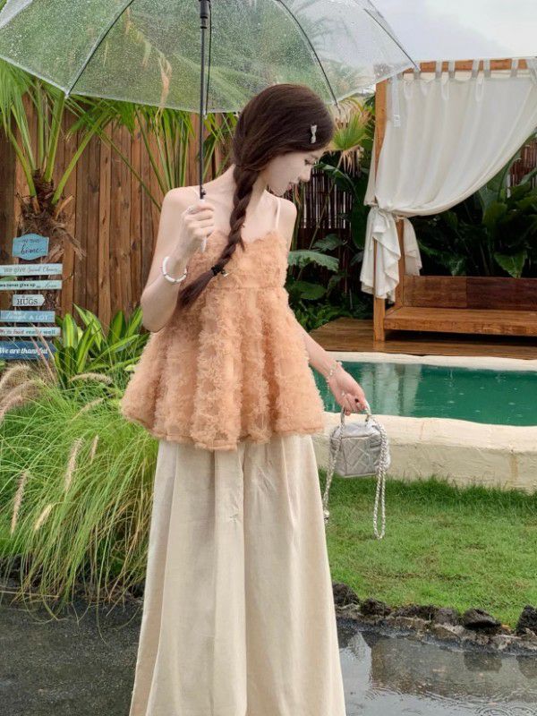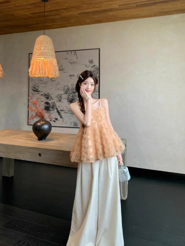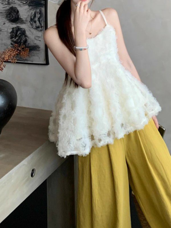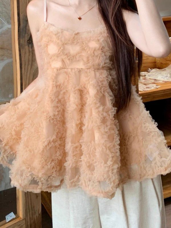 チュール素材のキャミソールトップスは、軽やかで可愛いらしいアイテムです。