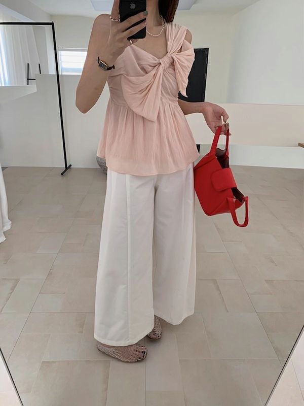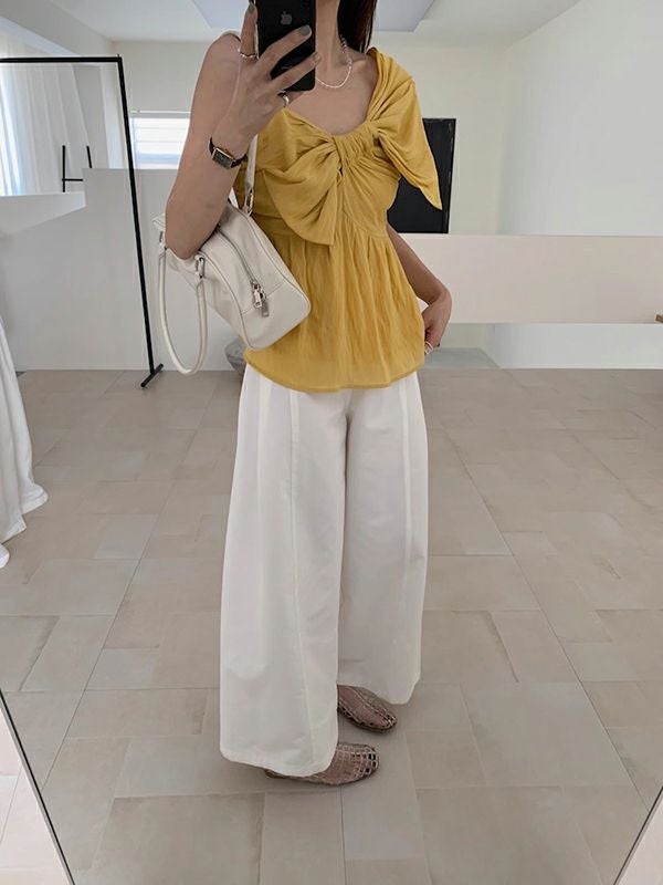 デニムやワイドパンツ、スカートとも相性抜群で、夏のスタイリングがぐっと華やかに。