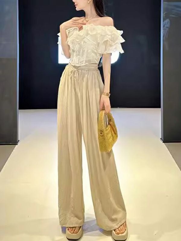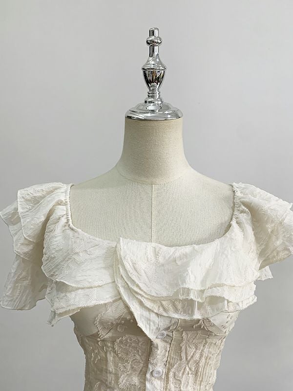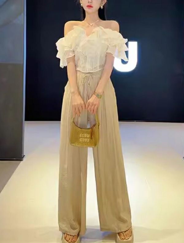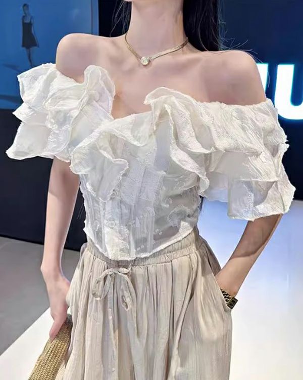 エレガントなフリルと上品なディテールが、シンプルながらも印象的なスタイルを作り上げます。