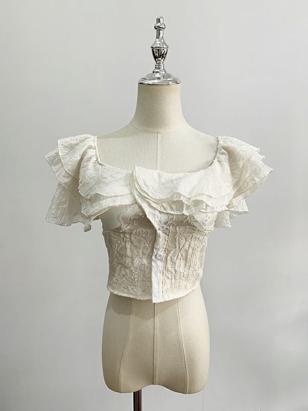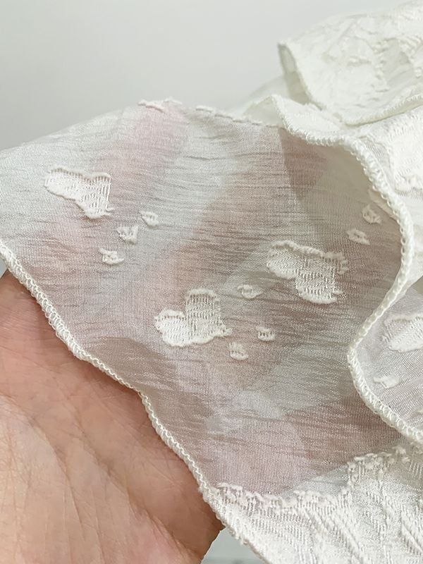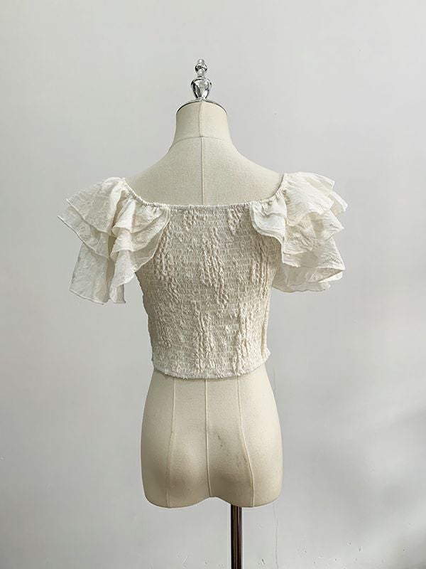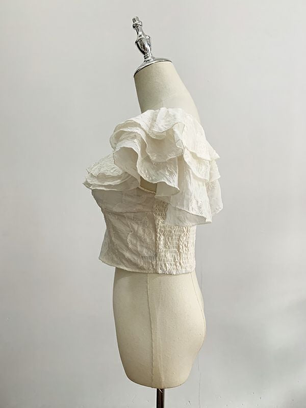華やかなフリルとエンボス加工が特徴のベアトップ。