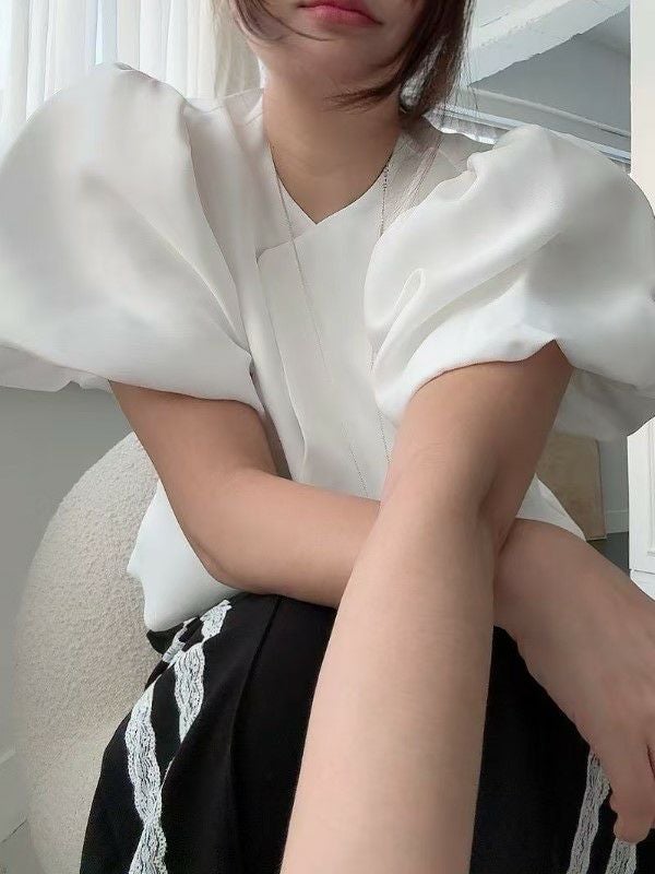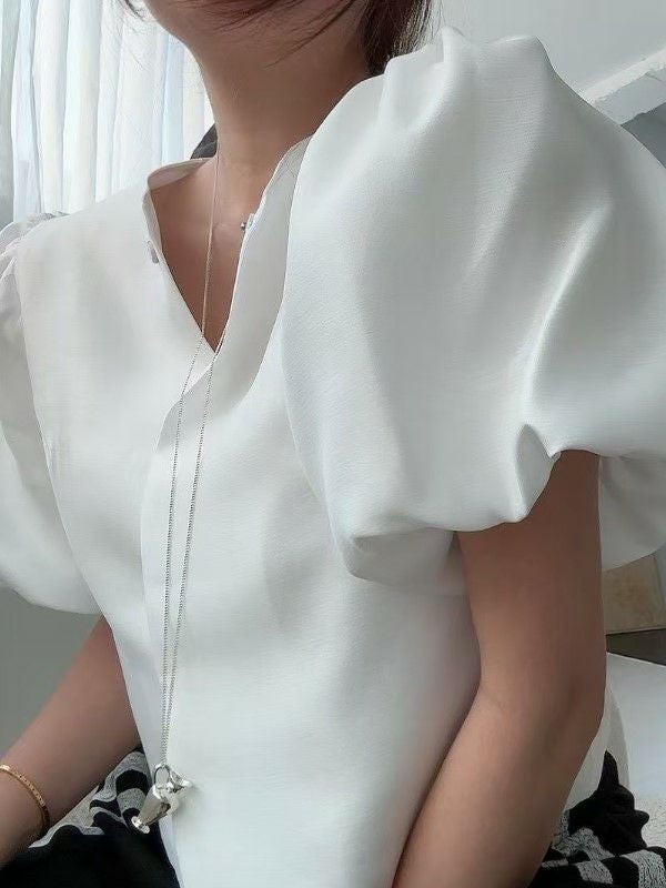 パフスリーブとクルーネックが女性らしさを引き立てる、上品なデザイン