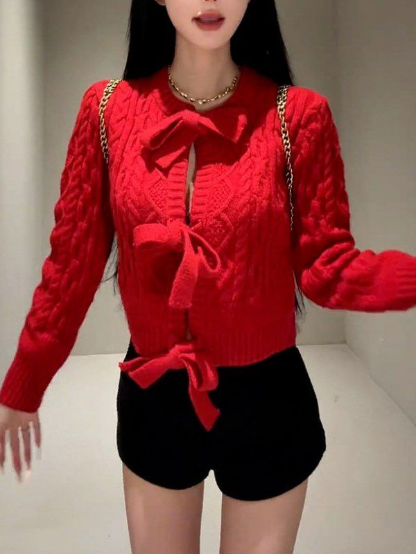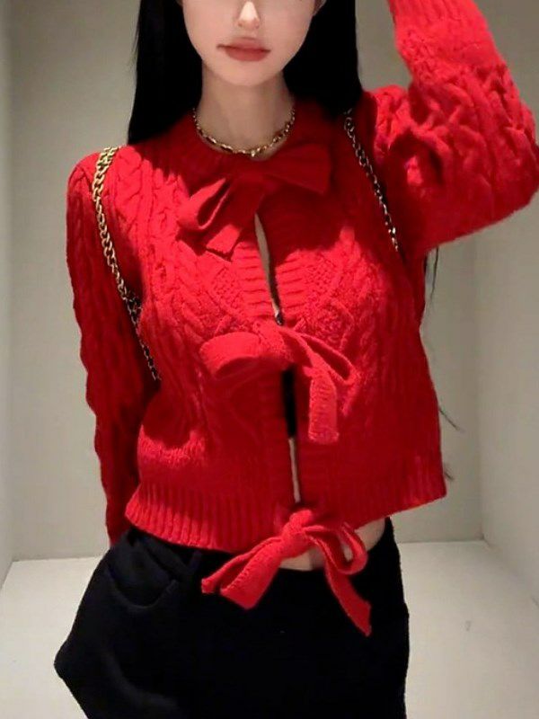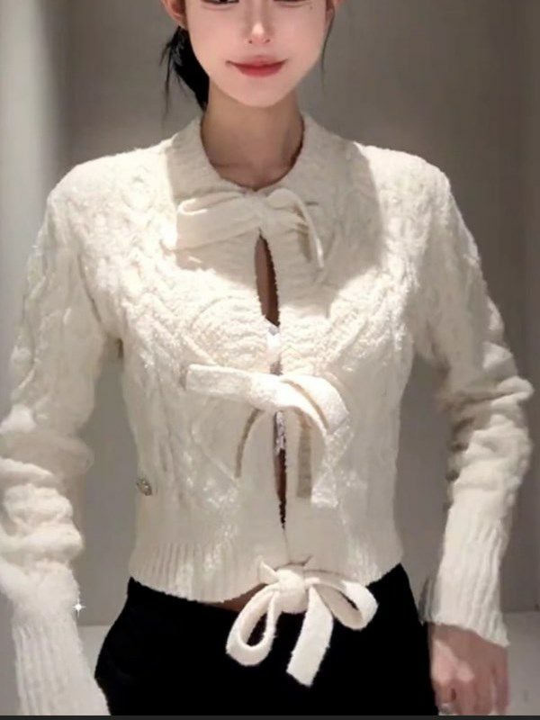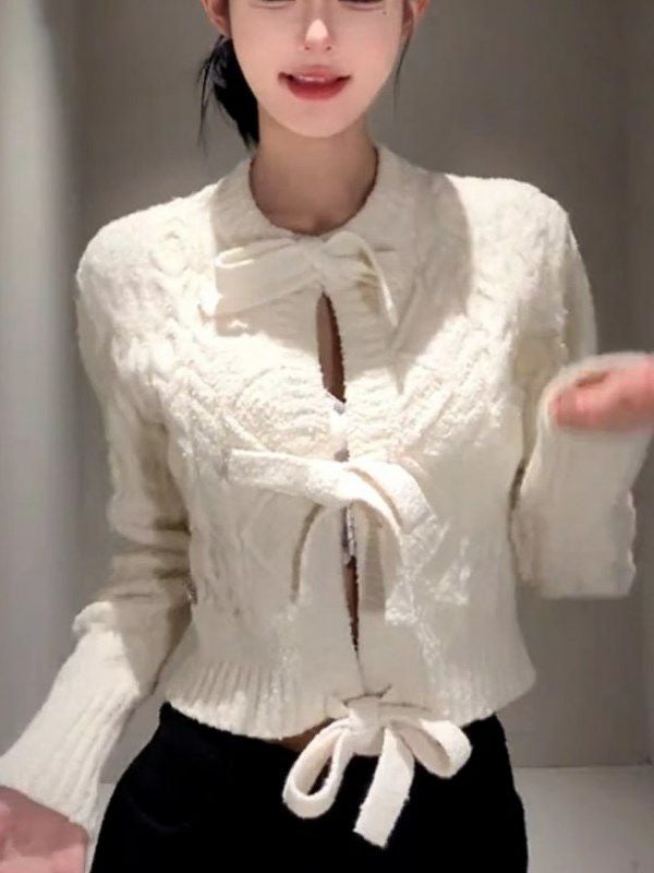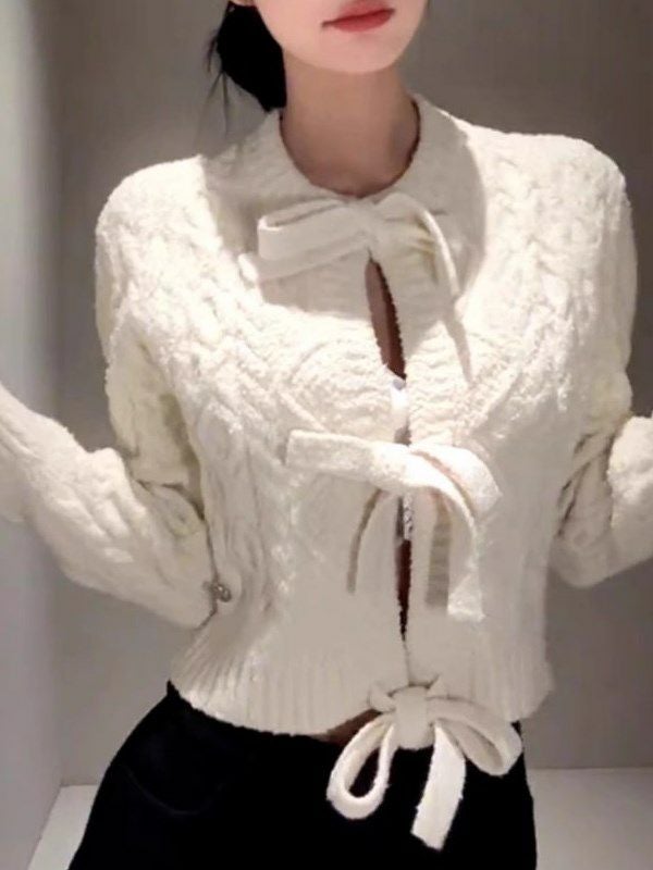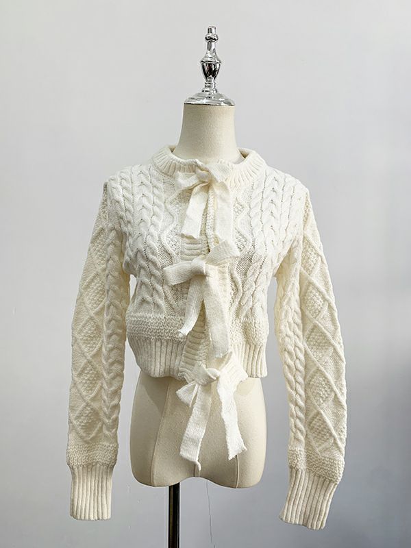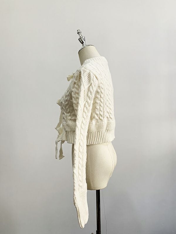 立体感のあるケーブル編みにリボンをあしらったカーディガン。