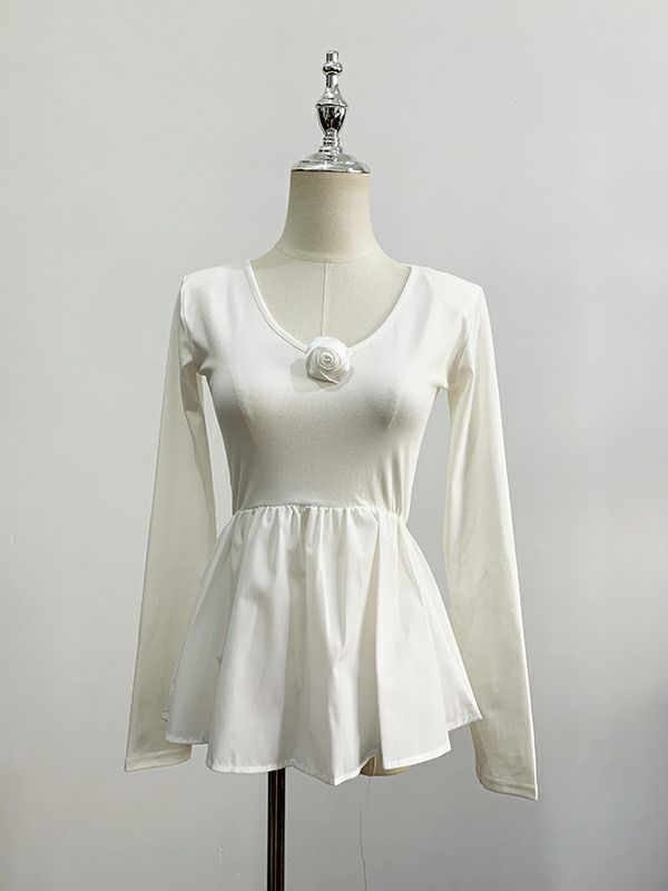 深めのUネックにローズモチーフのブローチを添えたペプラムTEE。