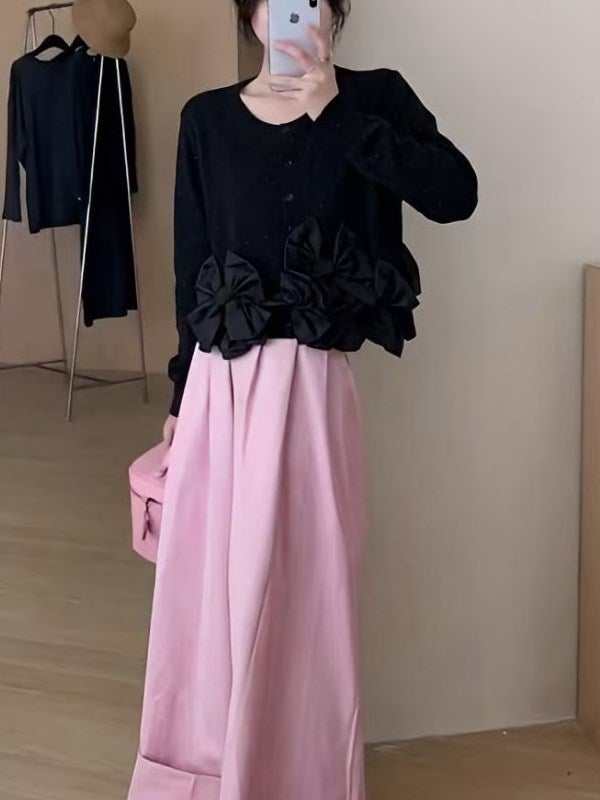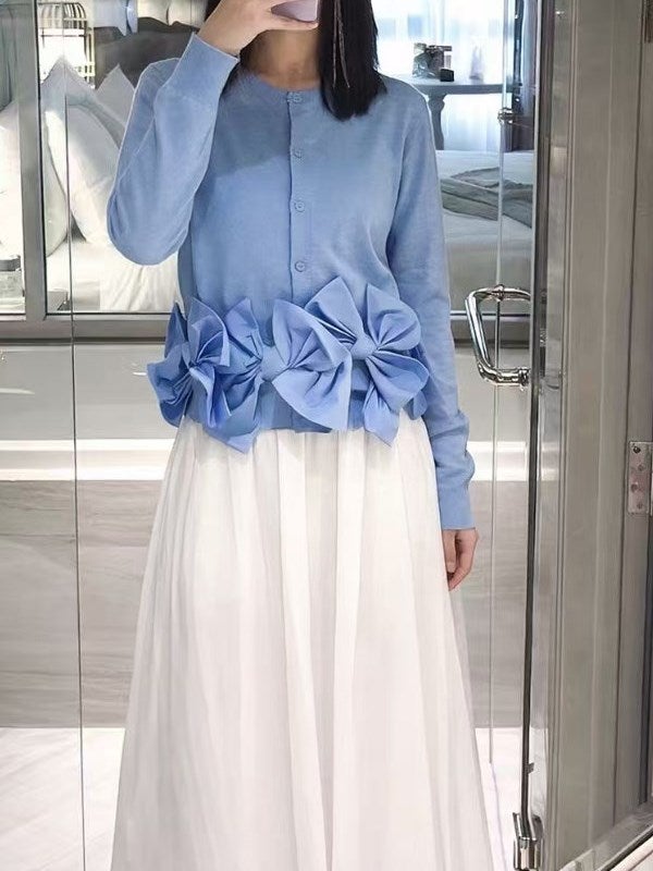 フロントの裾にあしらった立体的なリボンが、コーディネートにドラマティックなアクセントを添えるニットカーディガン。