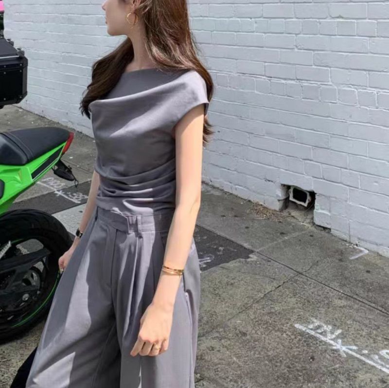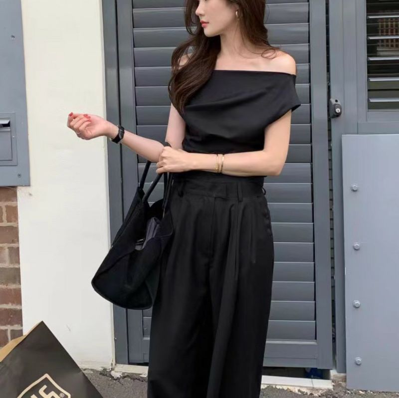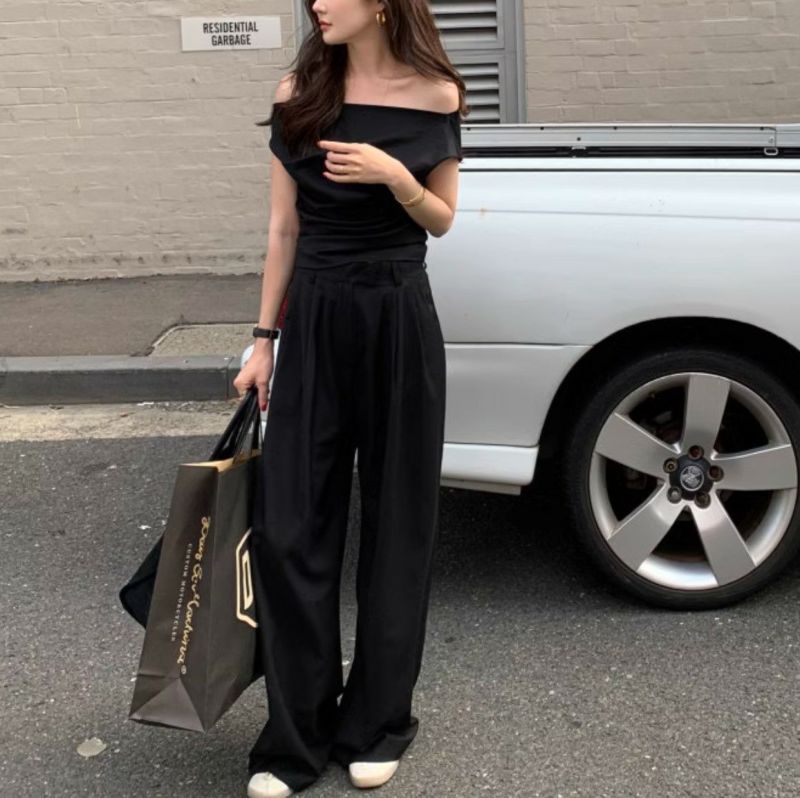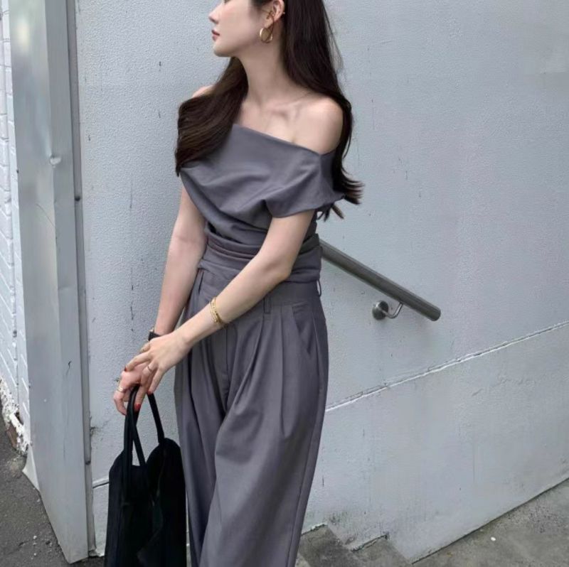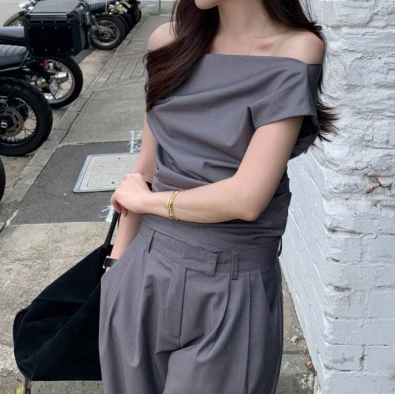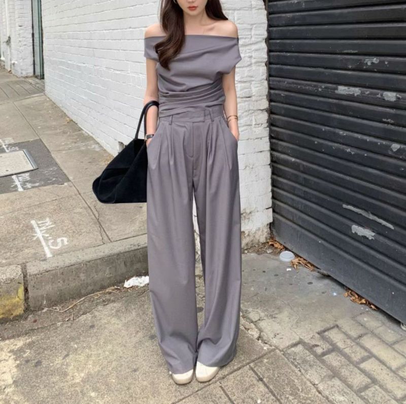 予約 2color オフショルダー ドレープ トップス + ストレート パンツ