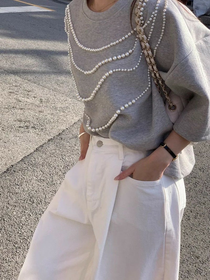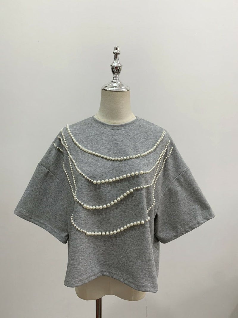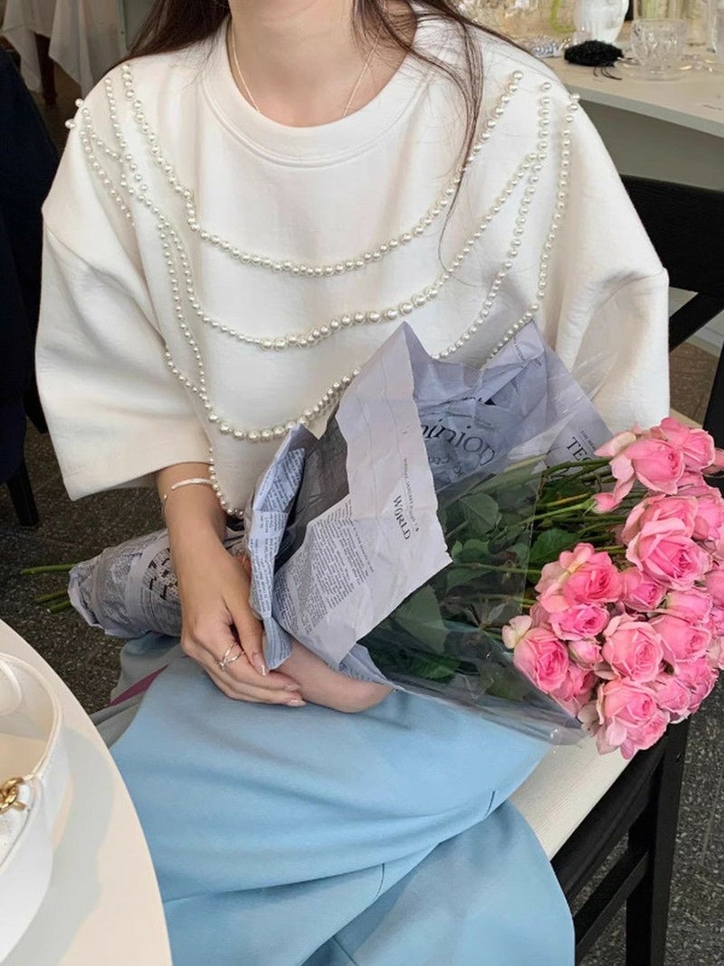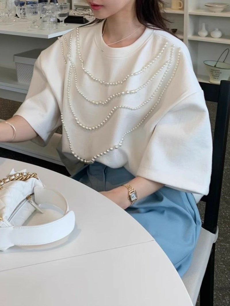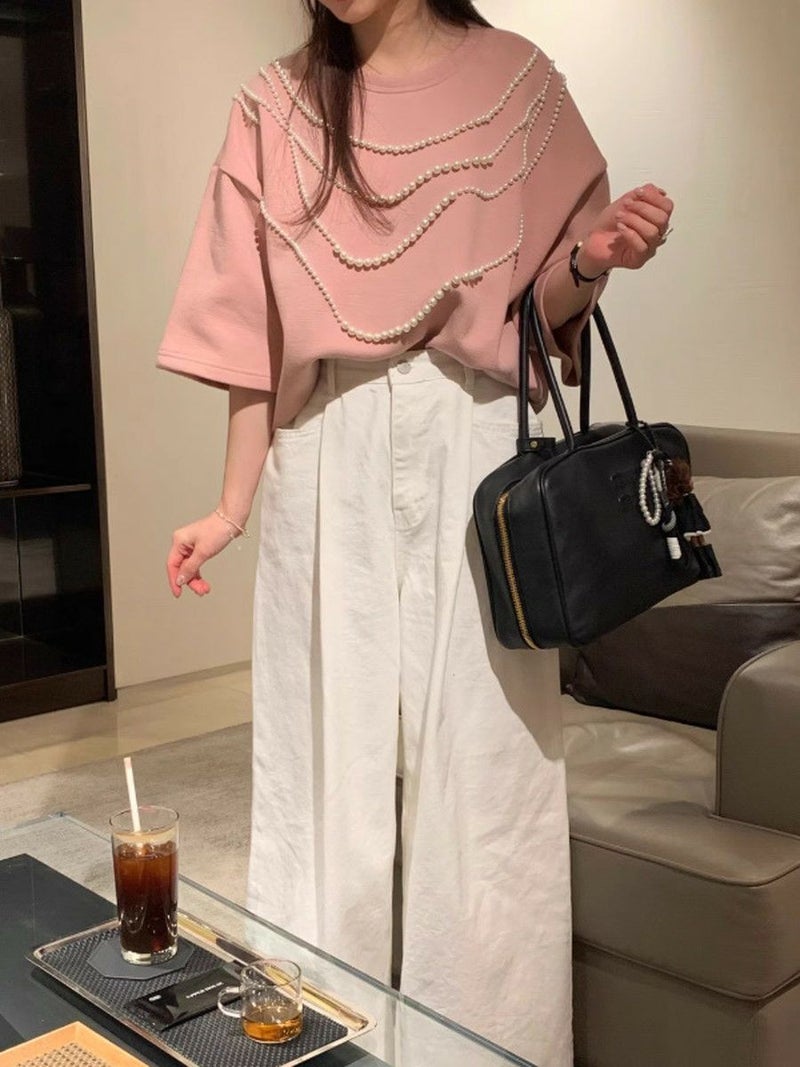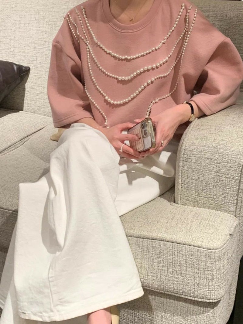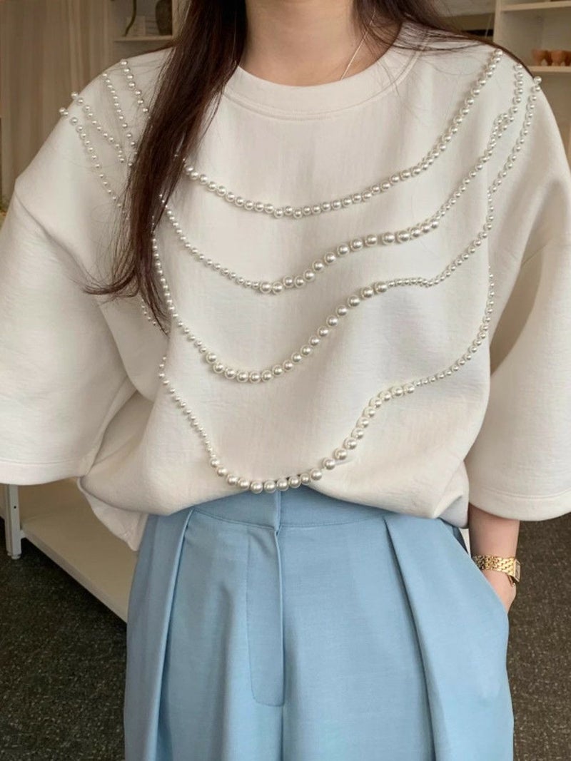 高級感ある生地にパールが大胆にデザインされたハーフスリーブトップス
