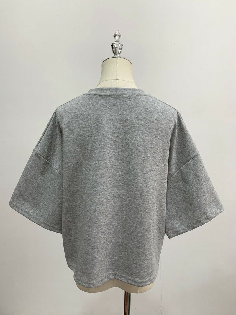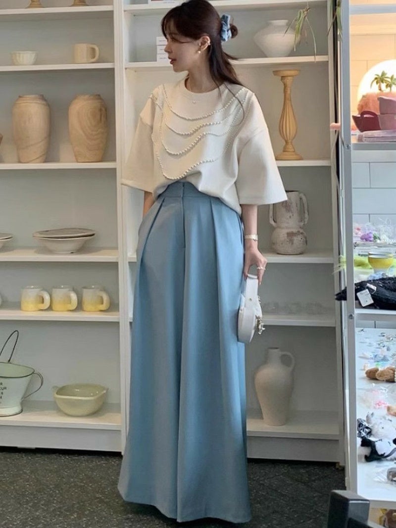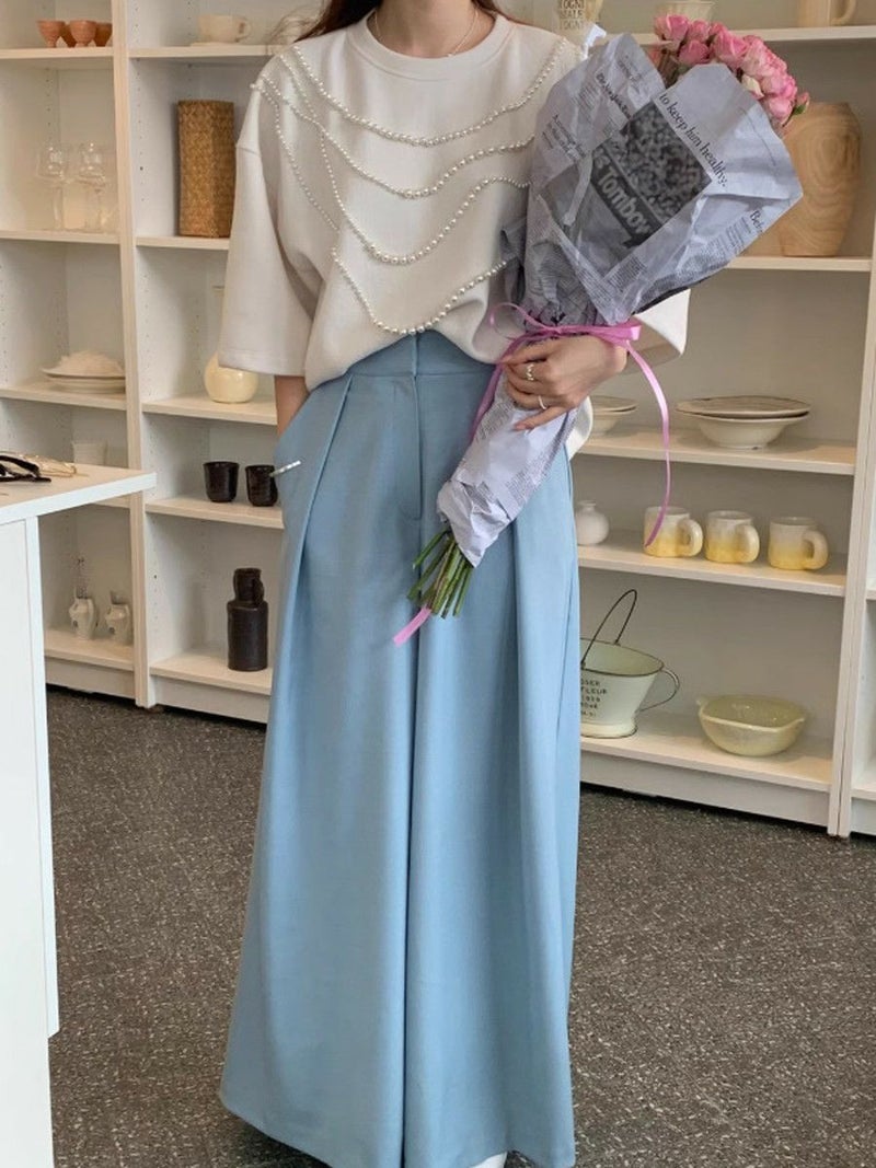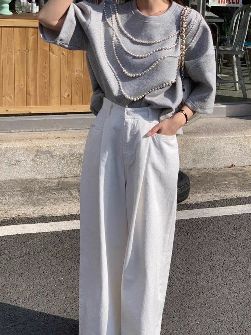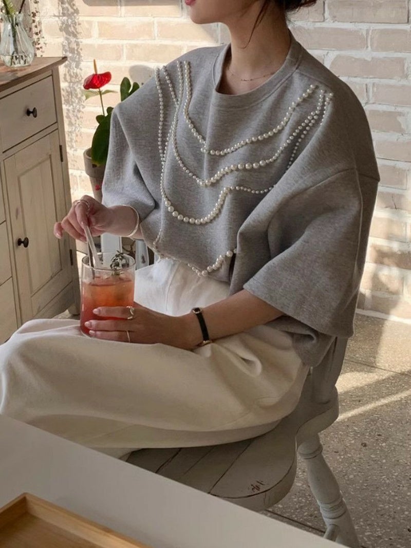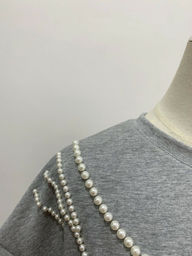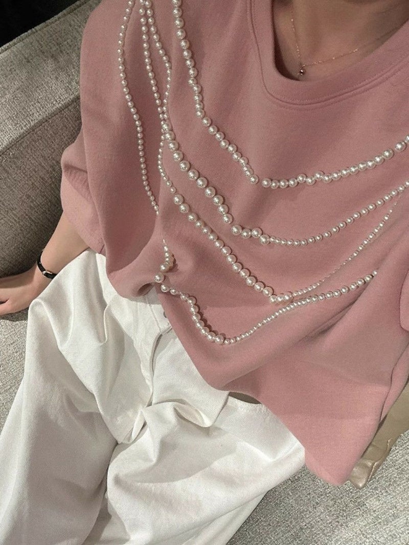 高級感ある生地にパールが大胆にデザインされたハーフスリーブトップス